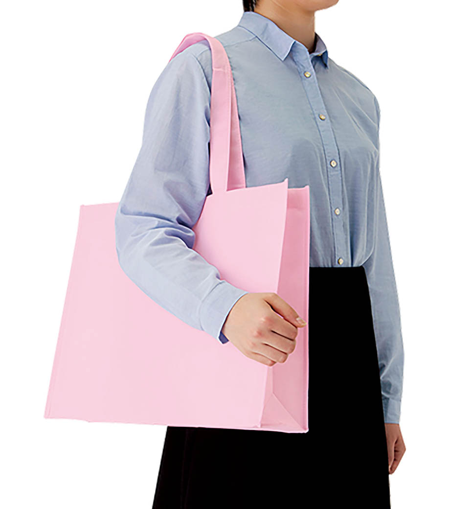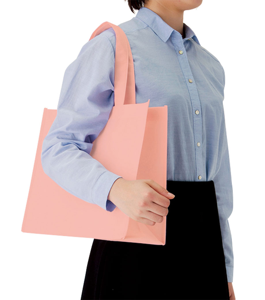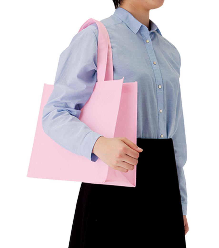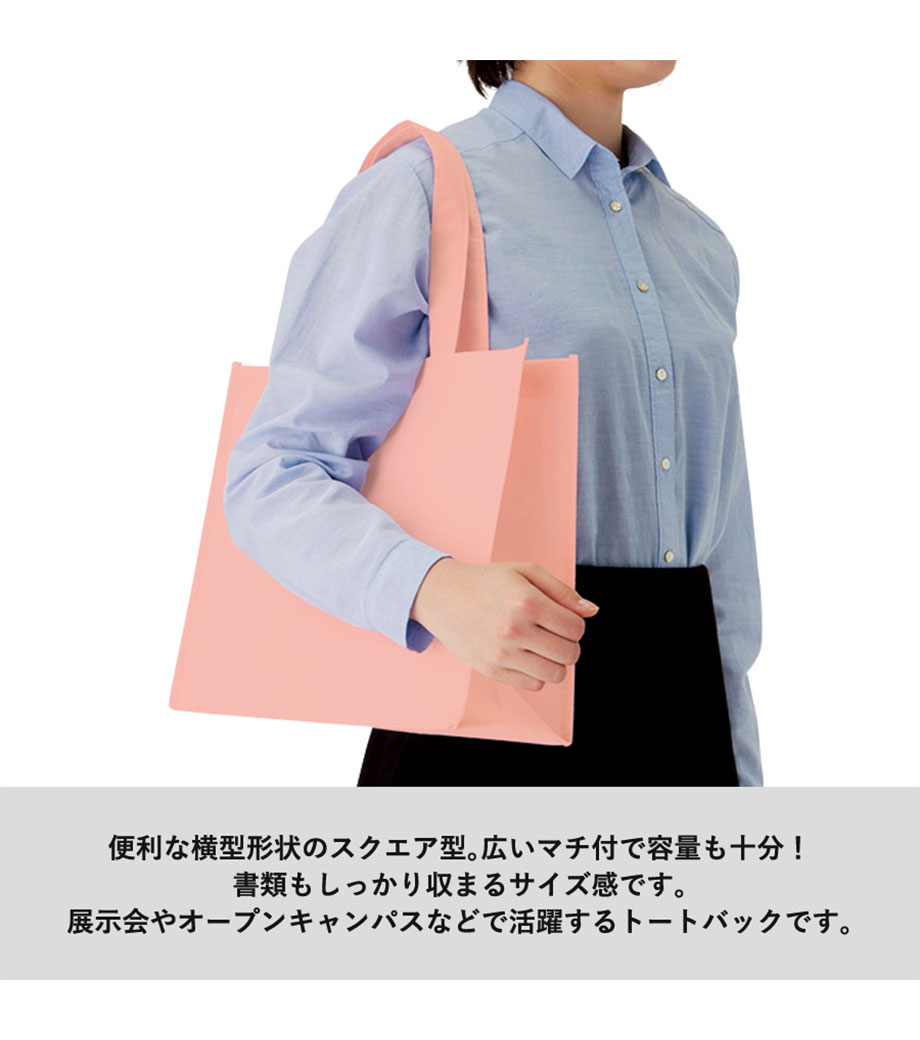 不織布とは、繊維を織らずに絡み合わせたシート状の素材。紙のように軽いうえ、紙より耐久性があるため、繰り返し使えるエコ素材として人気です。不織布スクエアトートは、ゆとりのマチで収納力が自慢。カラフルな色合いが楽しいバッグです。