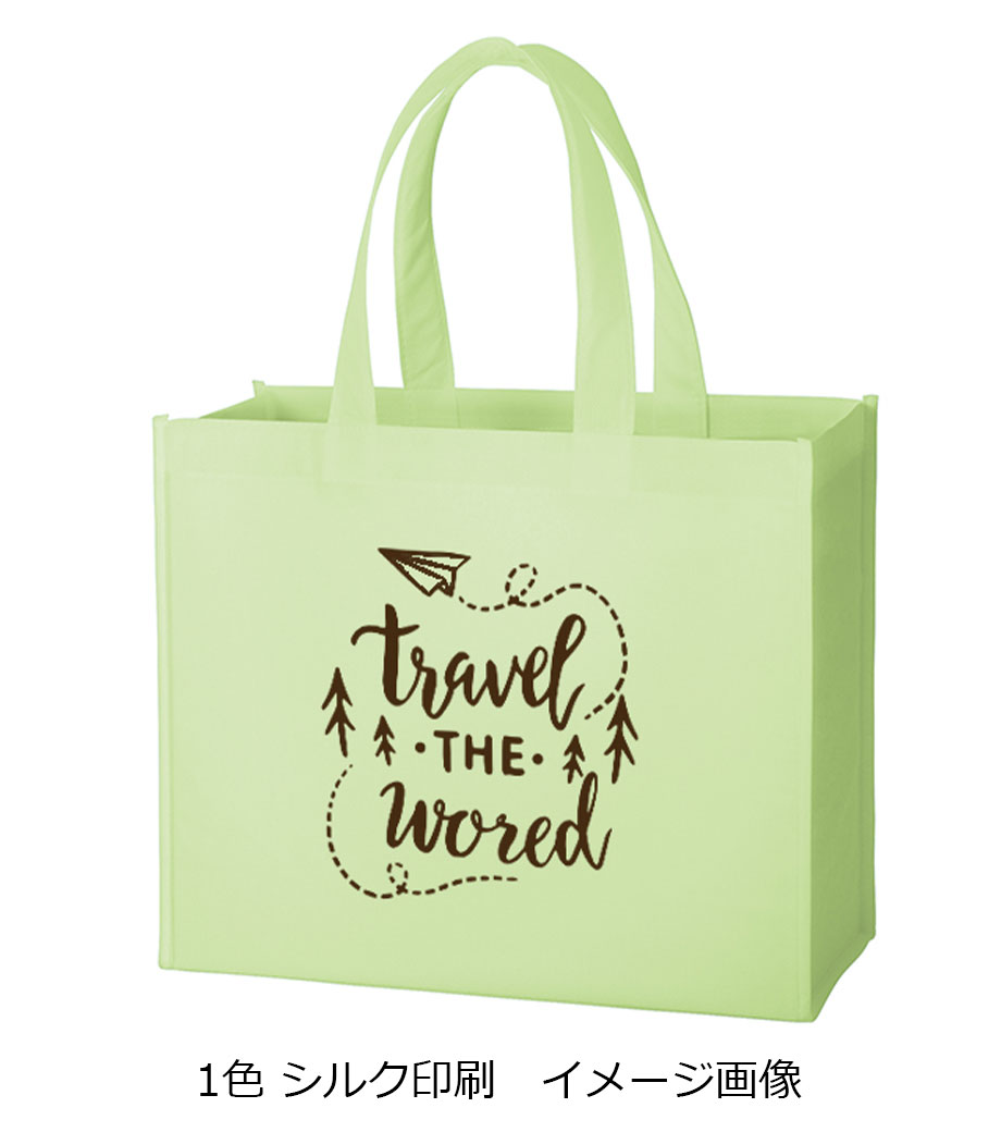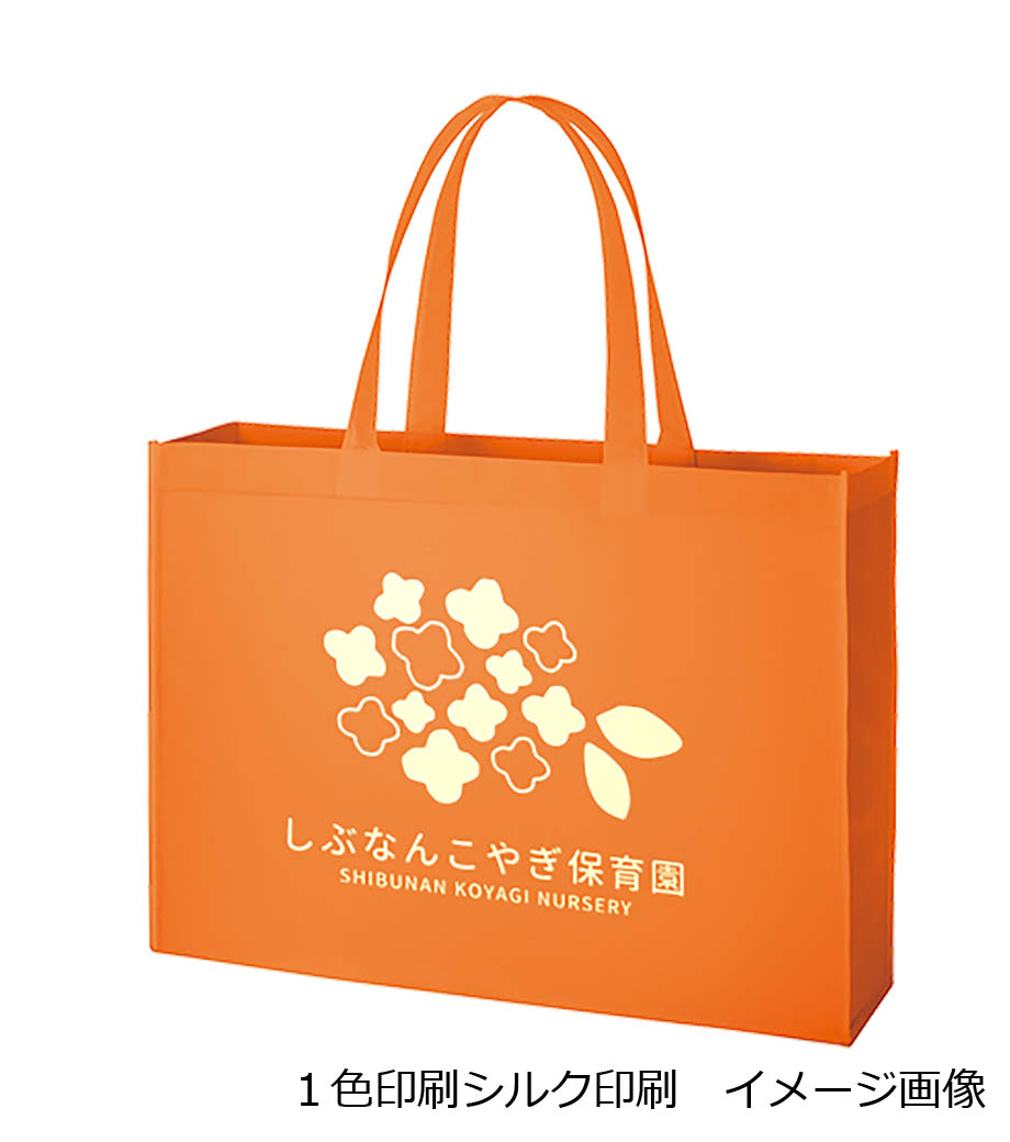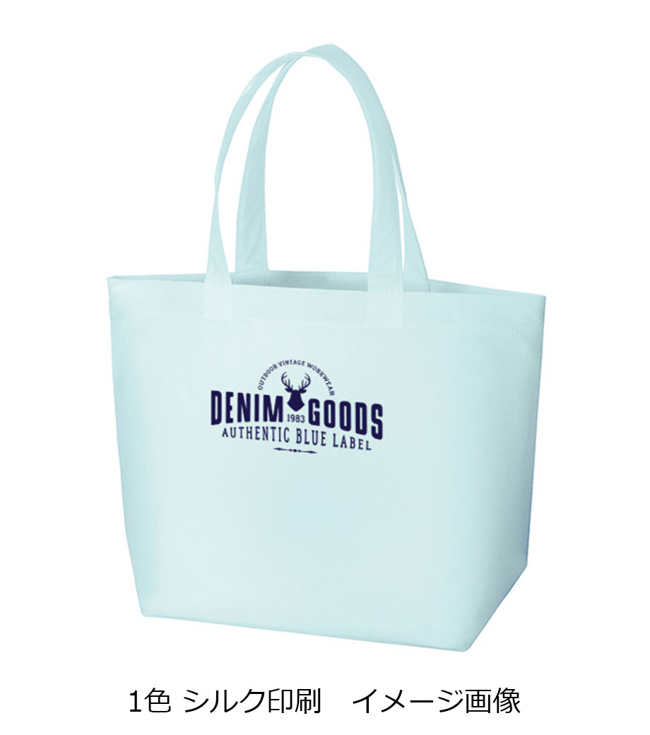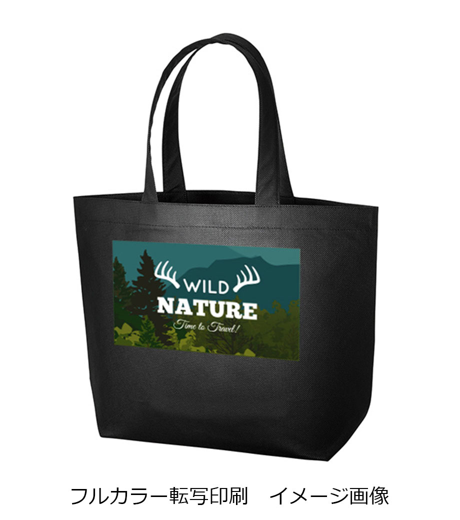 バッグの中央にシルク1色印刷とフルカラー転写印刷が可能です。印刷範囲が広くシンプルなデザインに名入れが映えます。アパレルのショップバッグやイベントのノベルティとしてご活用ください。