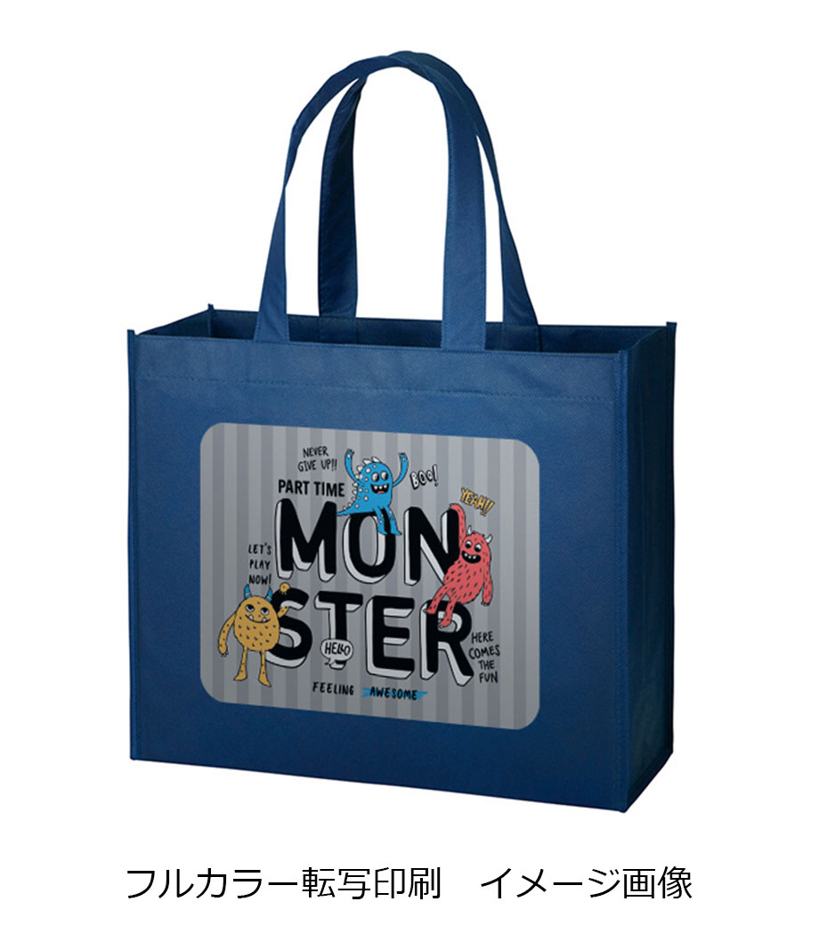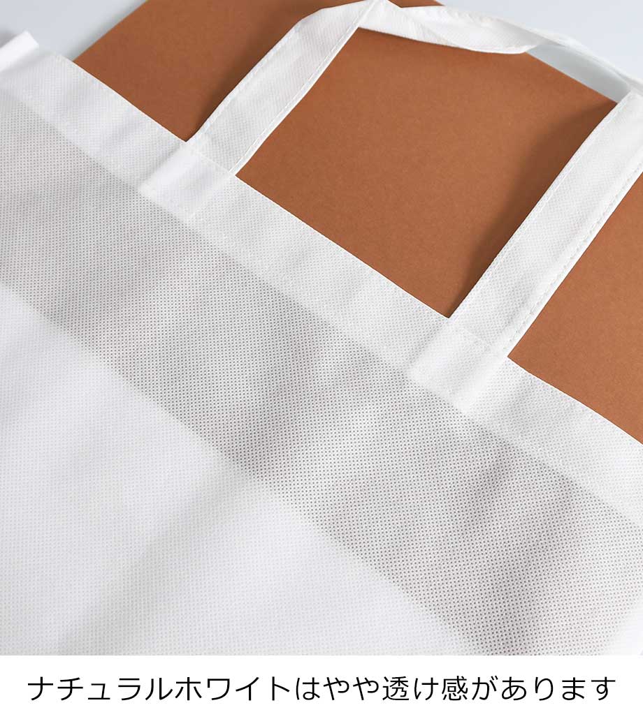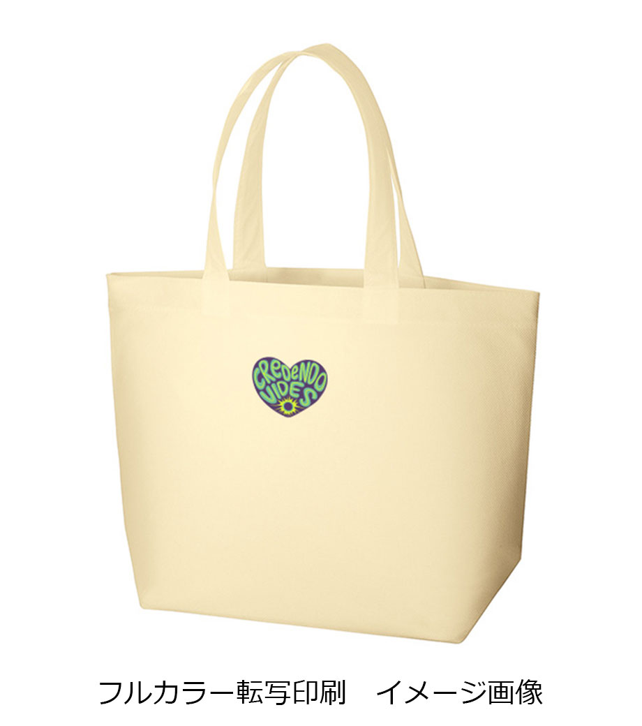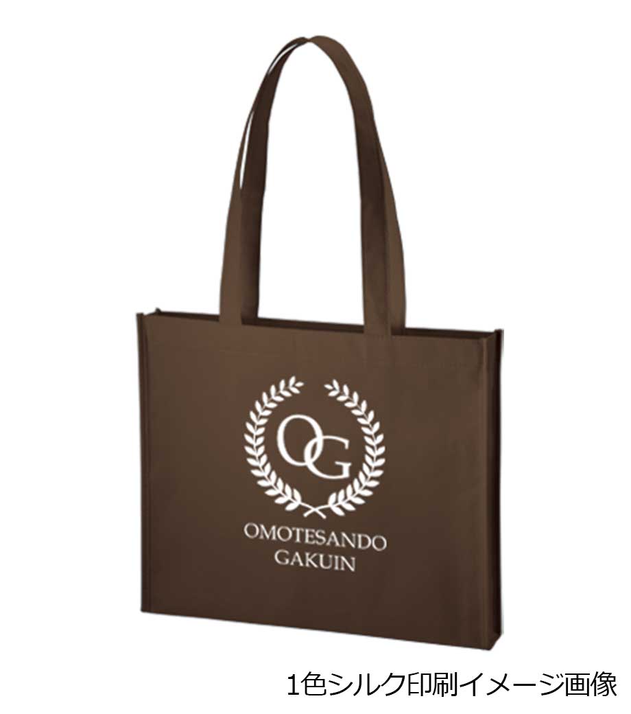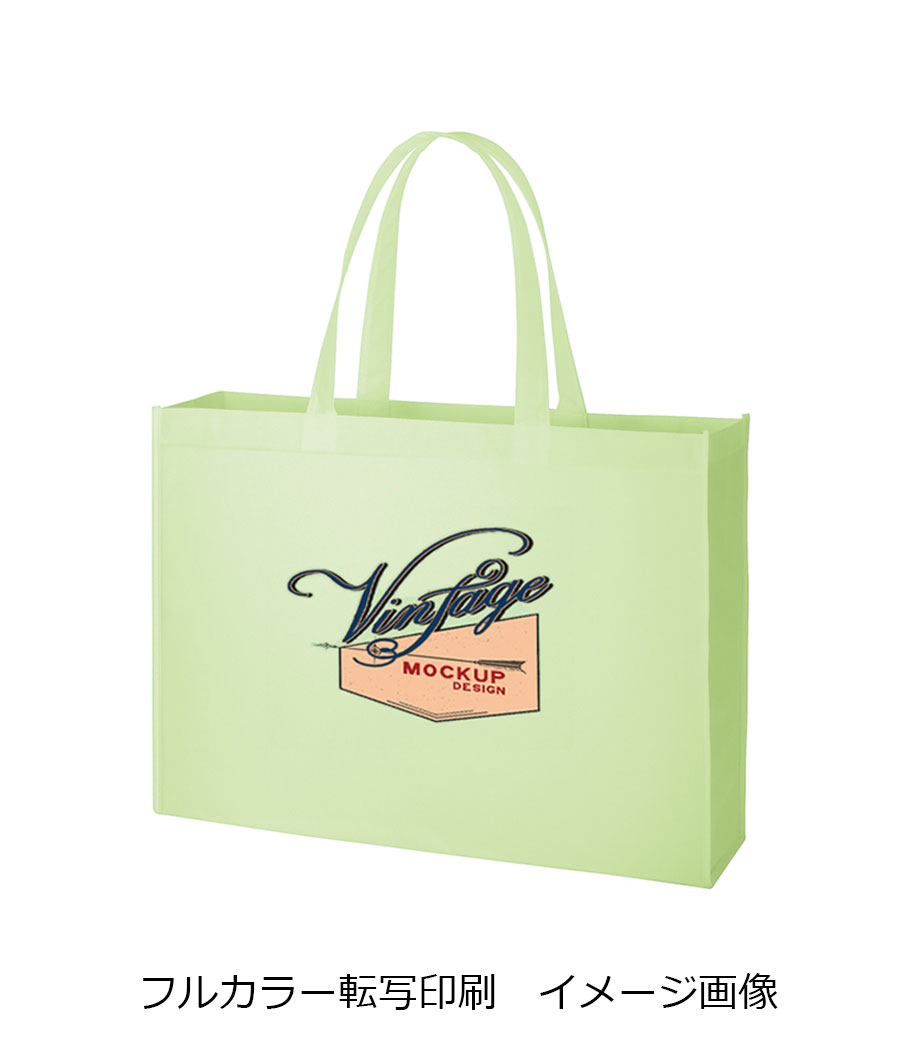 バッグの中央にシルク1色印刷とフルカラー転写印刷が可能です。印刷範囲が広くシンプルなデザインに名入れが映えます。アパレルのショップバッグやイベントのノベルティとしてご活用ください。