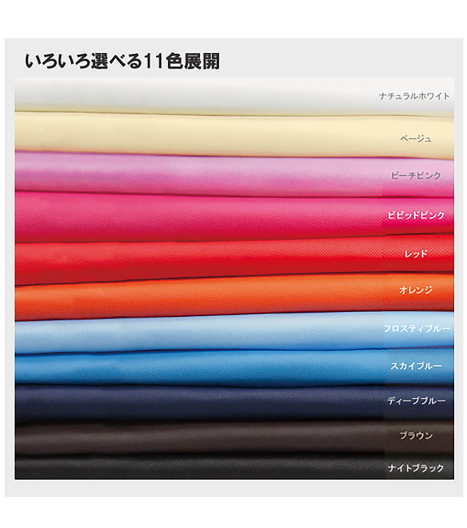 カラーは幅広いニーズに対応した11色をご用意。企業や学校のイメージに合ったカラーを選べます。フルカラーでの名入れも可能なので、同人イベントでオリジナルバッグとして頒布しても◎。お手頃価格でノベルティを作りたい時におすすめのアイテムです。