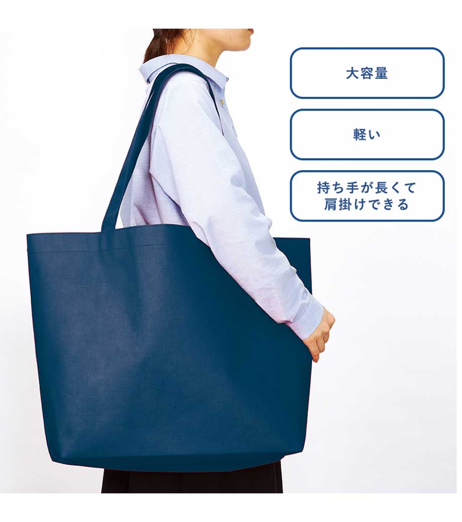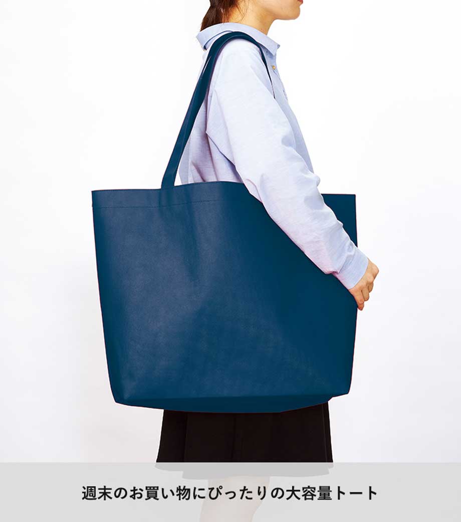 不織布ビッグショッピングトートは、週末のお買い物にぴったりの大容量トートバッグです。箱ティッシュやトイレットペーパーのような大きくてかさばるモノを入れるのにおすすめ。肩掛けできて便利です。折りたたんでバッグや車に入れておけばいつでもすぐに使えます。