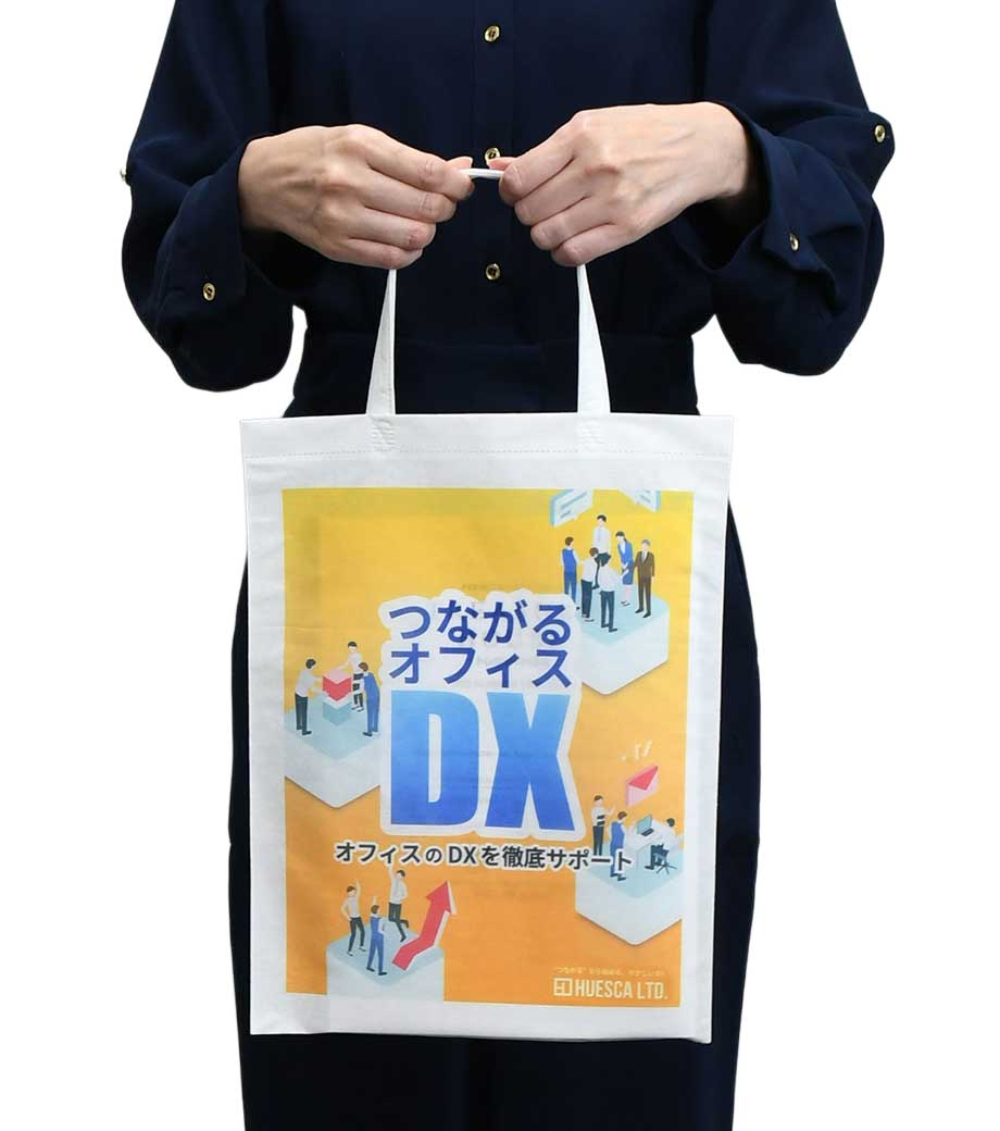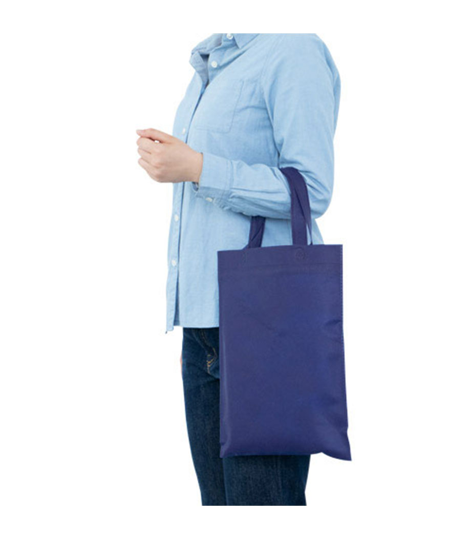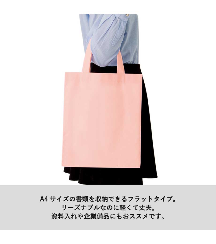 A4サイズの書類を入れるのにぴったりのマチなしトートバッグ。軽くてかさばらない不織布素材は、オープンキャンパスや展示会で資料を入れるバッグの定番です。