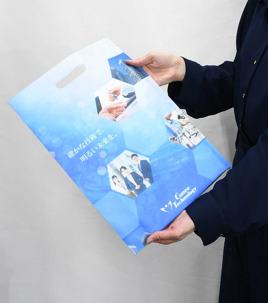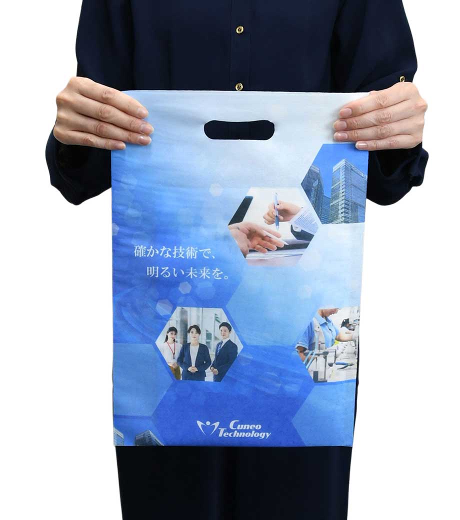 1色やフルカラーで広範囲に名入れが可能。社名やロゴを入れたオリジナルバッグは目立つこと間違いなしです。