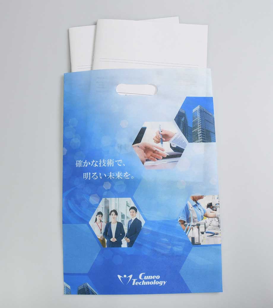 販売用の有料レジ袋にはもちろんのこと、カタログや資料配布用にもおすすめのアイテムです。サステイナブルが注目される今、企業のイメージアップにも繋がりますね。