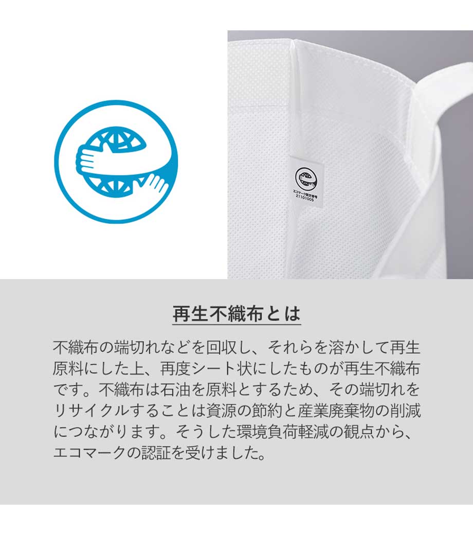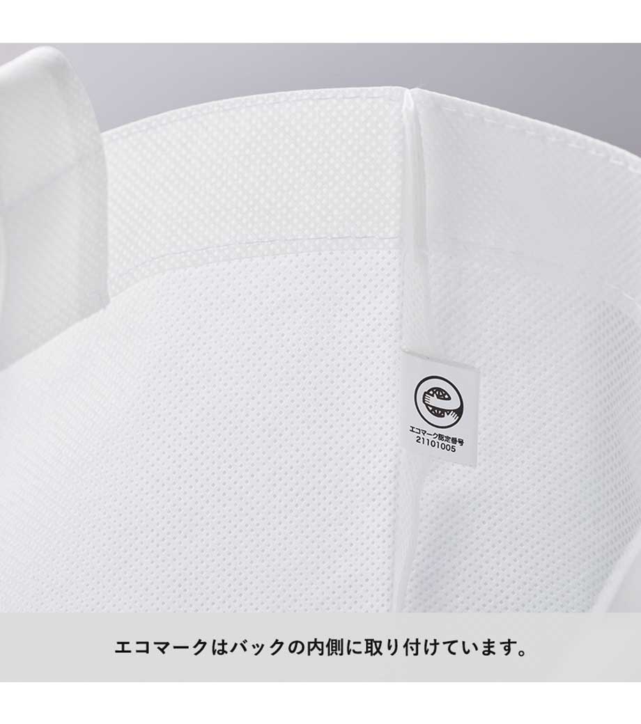 不織布の切れ端を集めて再利用した「再生不織布」を100%使用。お手頃価格ながらもエコマーク認証済みで、SDGsの取り組みに貢献できるノベルティです。