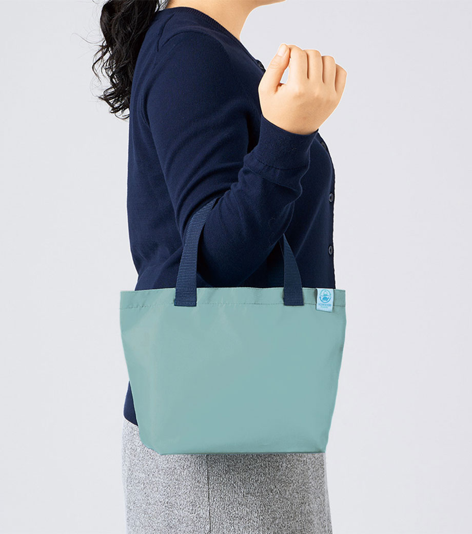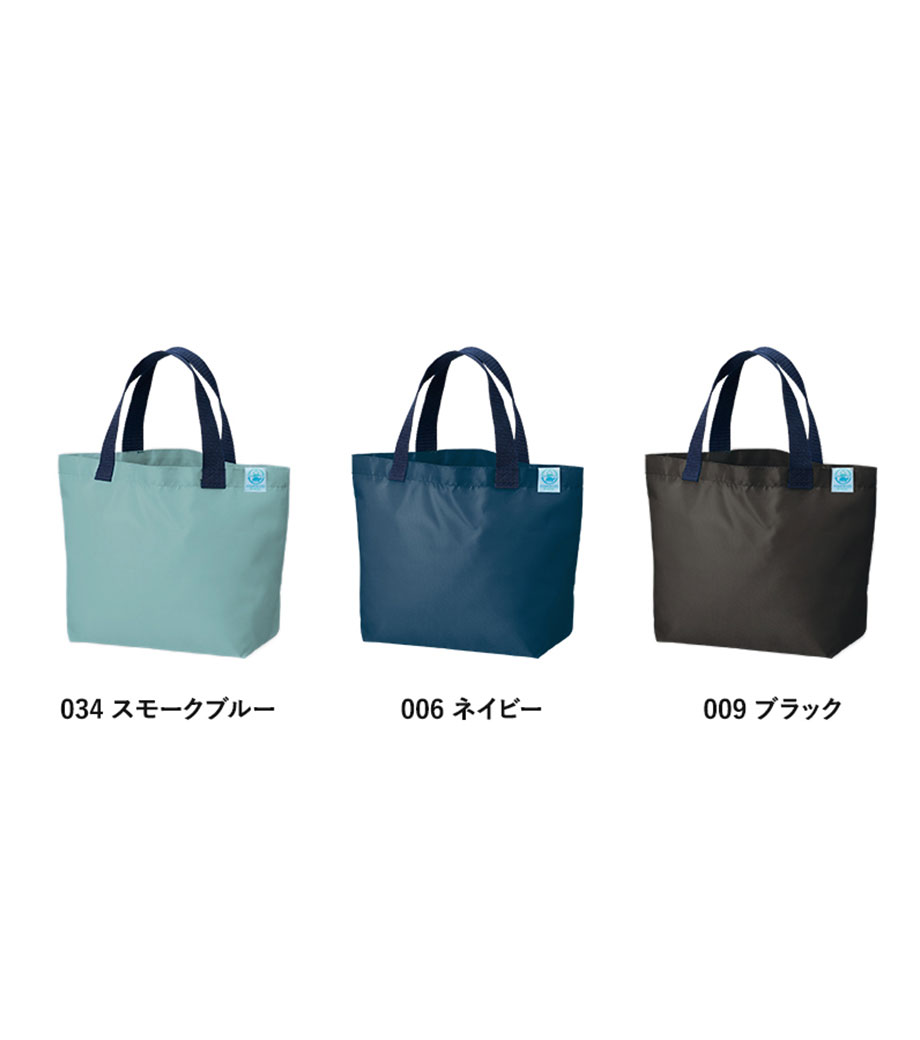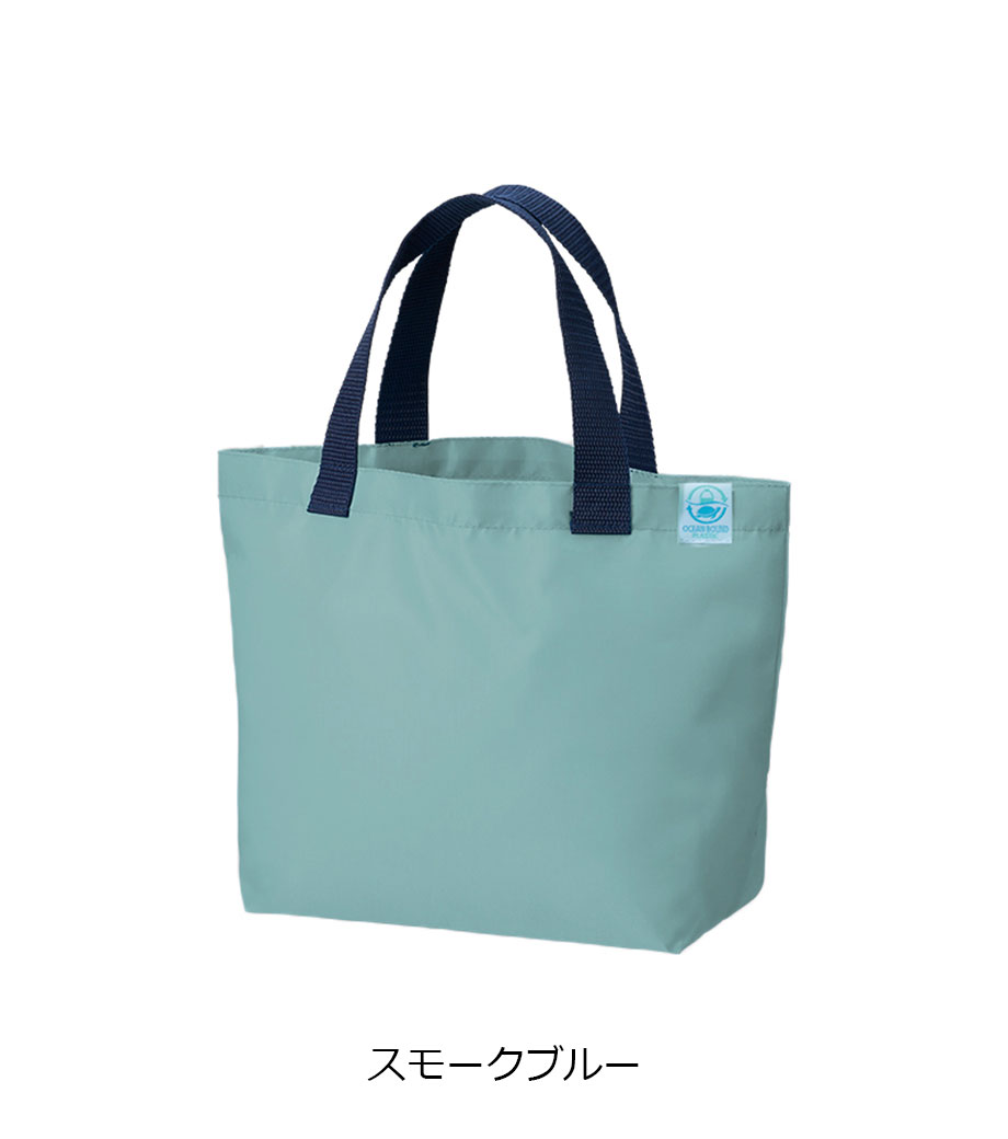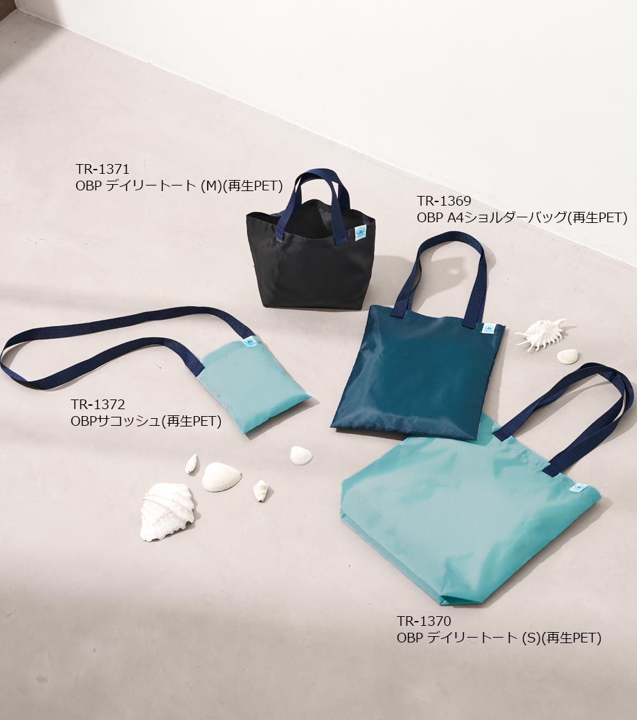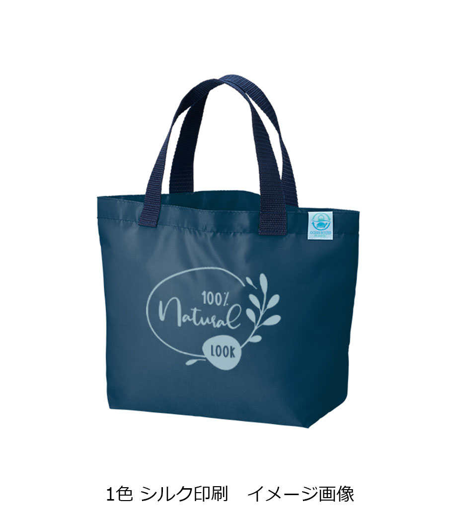 OBP素材を使用した環境にやさしい再生PETバッグ。海をイメージさせる3色展開で、PETとウミガメがデザインされたOBP専用のネームタグが付いています。ちょっとしたお買い物にも使いやすい舟底マチのトートバッグ。1色・フルカラー印刷でオリジナルバッグを作れます。お手頃な価格も魅力。SDGsイベントのプレゼントや、企業主催のキャンペーン特典など、幅広くご利用いただけます。