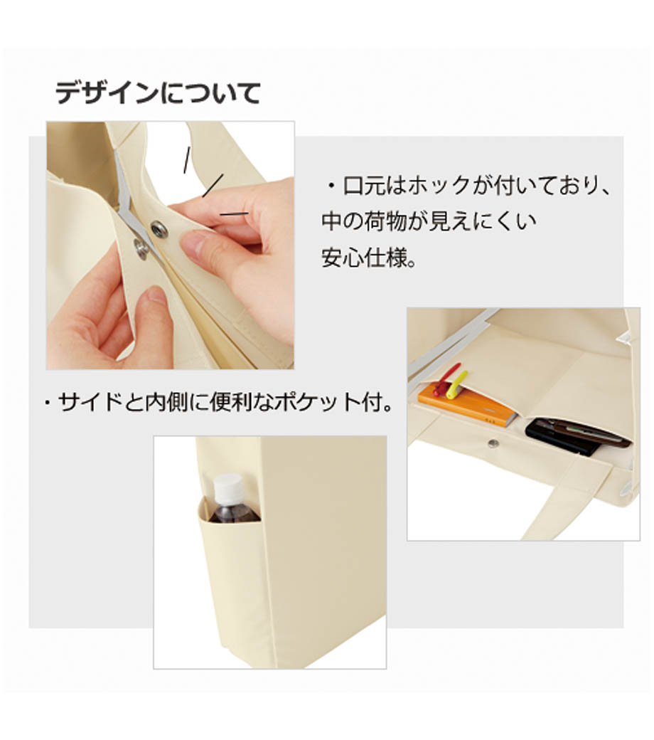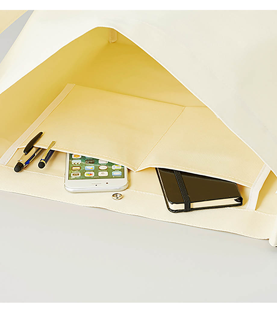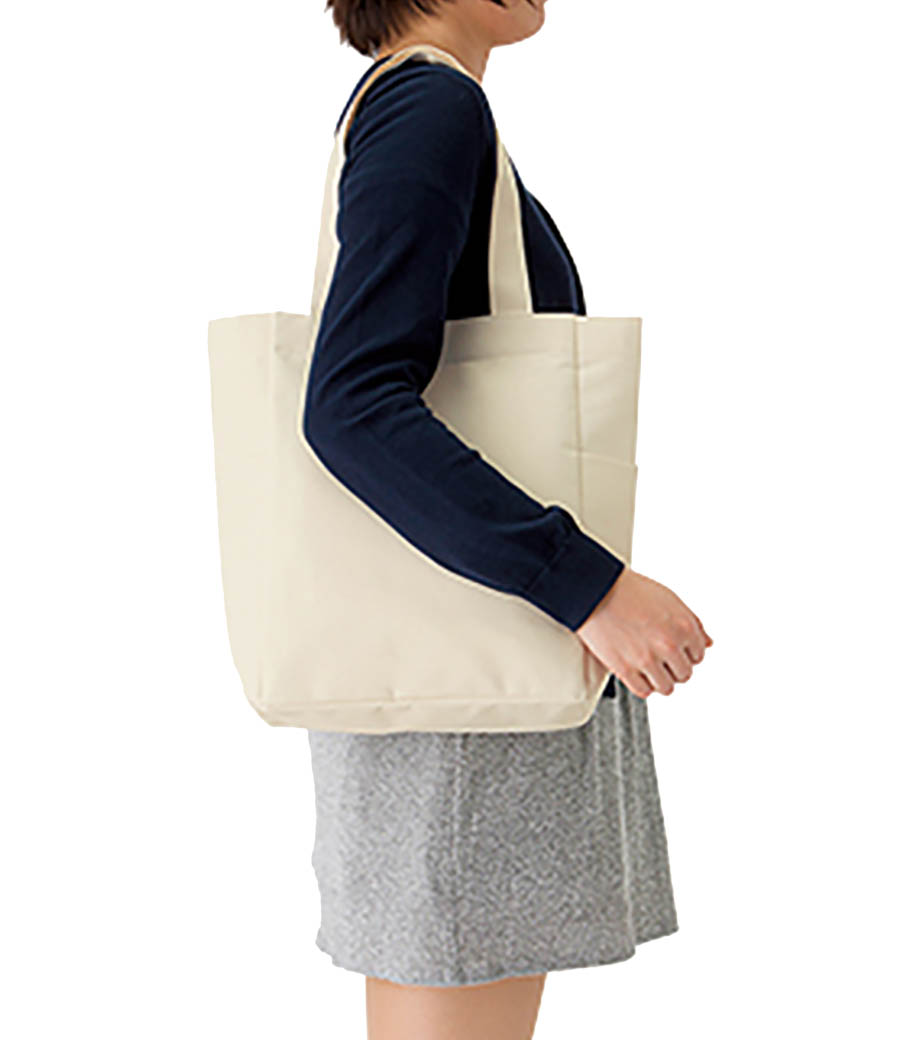 マルチ3ポケットトートは、外側に3つのポケットが付いた高機能トート。正面のポケットにはノートやスマホ、サイドポケットには折りたたみ傘やペットボトルを収納できます。