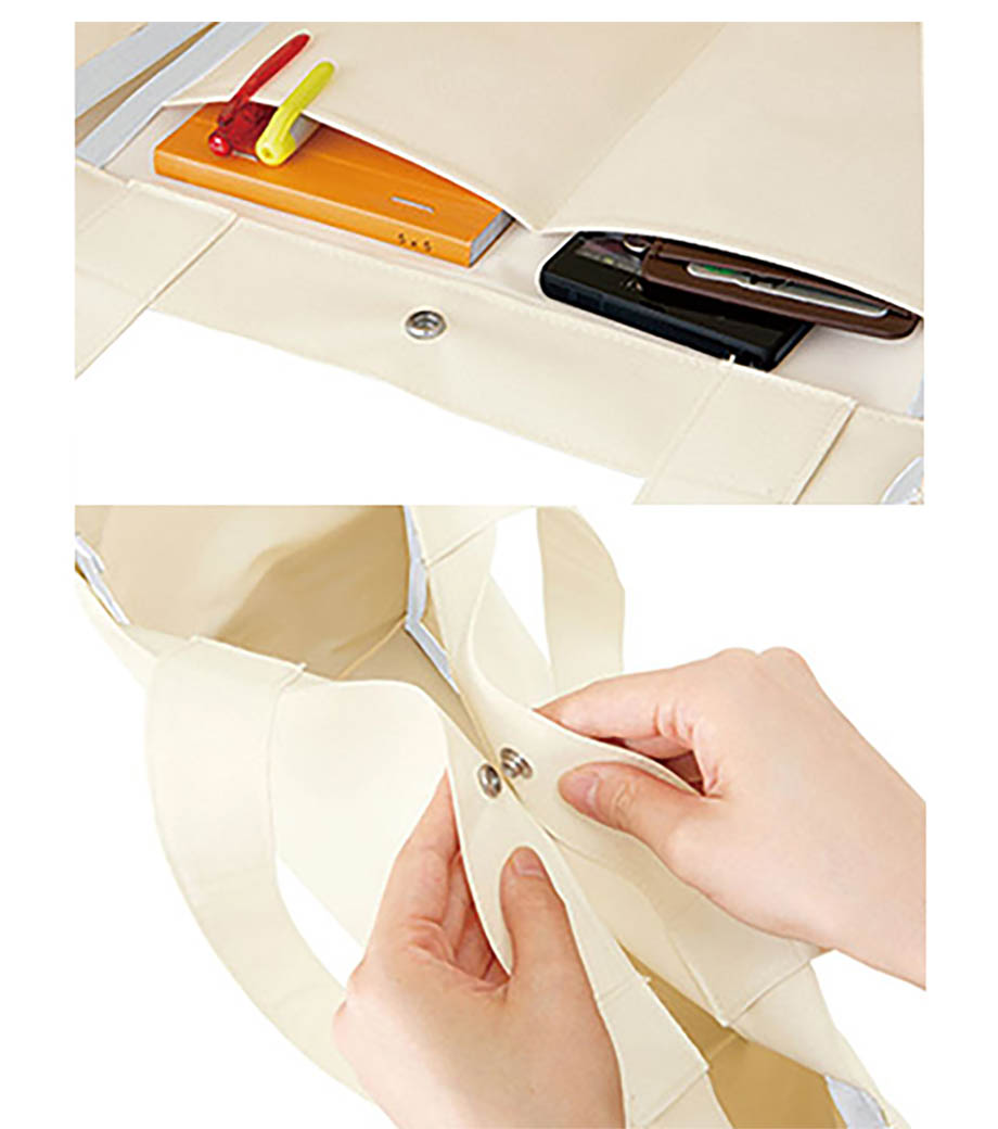 間口はスナップボタンでとめられるので、荷物の飛び出しを防ぎます。