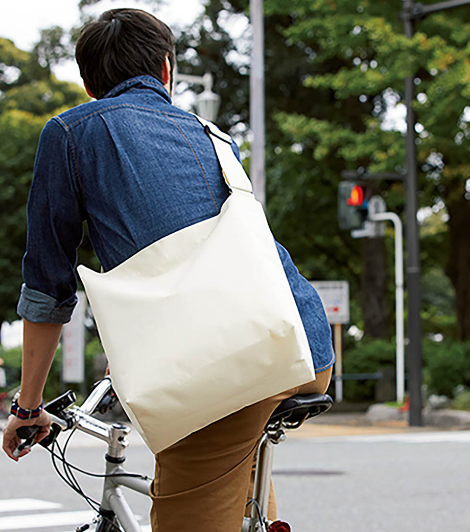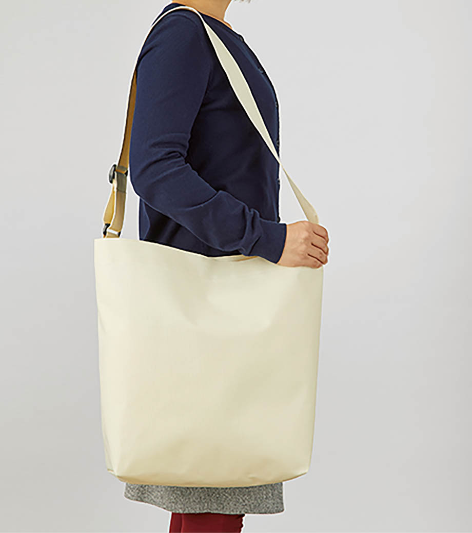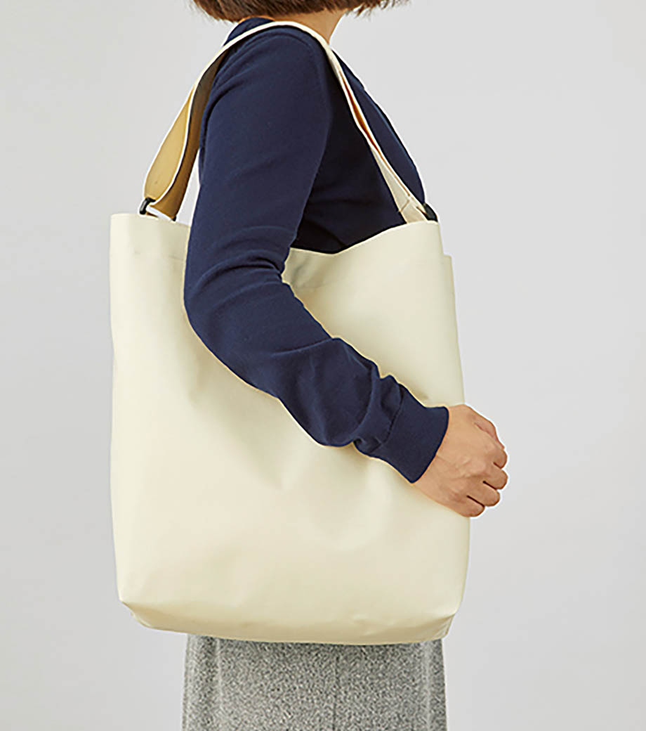 「マルチトート(L)」は、使い勝手のいい機能的なデザイン。折りたたみ傘やペットボトルが収納できるサイドポケット、便利な内ポケット付。間口はボタン止めできるから、荷物が飛び出さず安心です。収納力自慢のLサイズは、ふだんのお買い物やレジャーバッグにいかが。本体色は、ネイビーブルー・インクブラック・ミルキーベージュ・ワインレッド・ダークグリーンの5色から選べます。