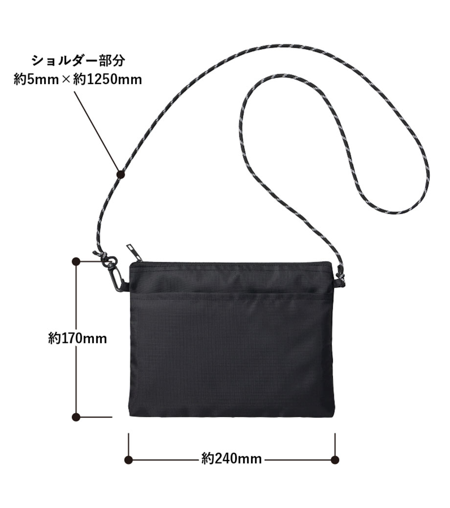 マチなしでフラットな横長サコッシュ。フロントに小物入れに便利なオープンポケット付きです。安心のファスナータイプなので、貴重品を入れて持ち歩くのにもぴったり。斜め掛けできるショルダーは、紐の結び目部分で長さの調節も可能です。どなたにもお使いいただきやすいデザイン。ポケットに1色・フルカラー印刷ができます。