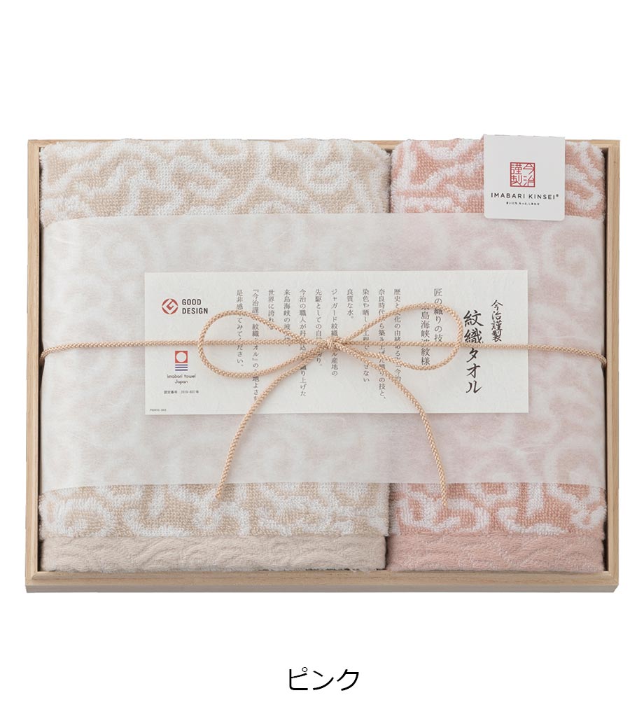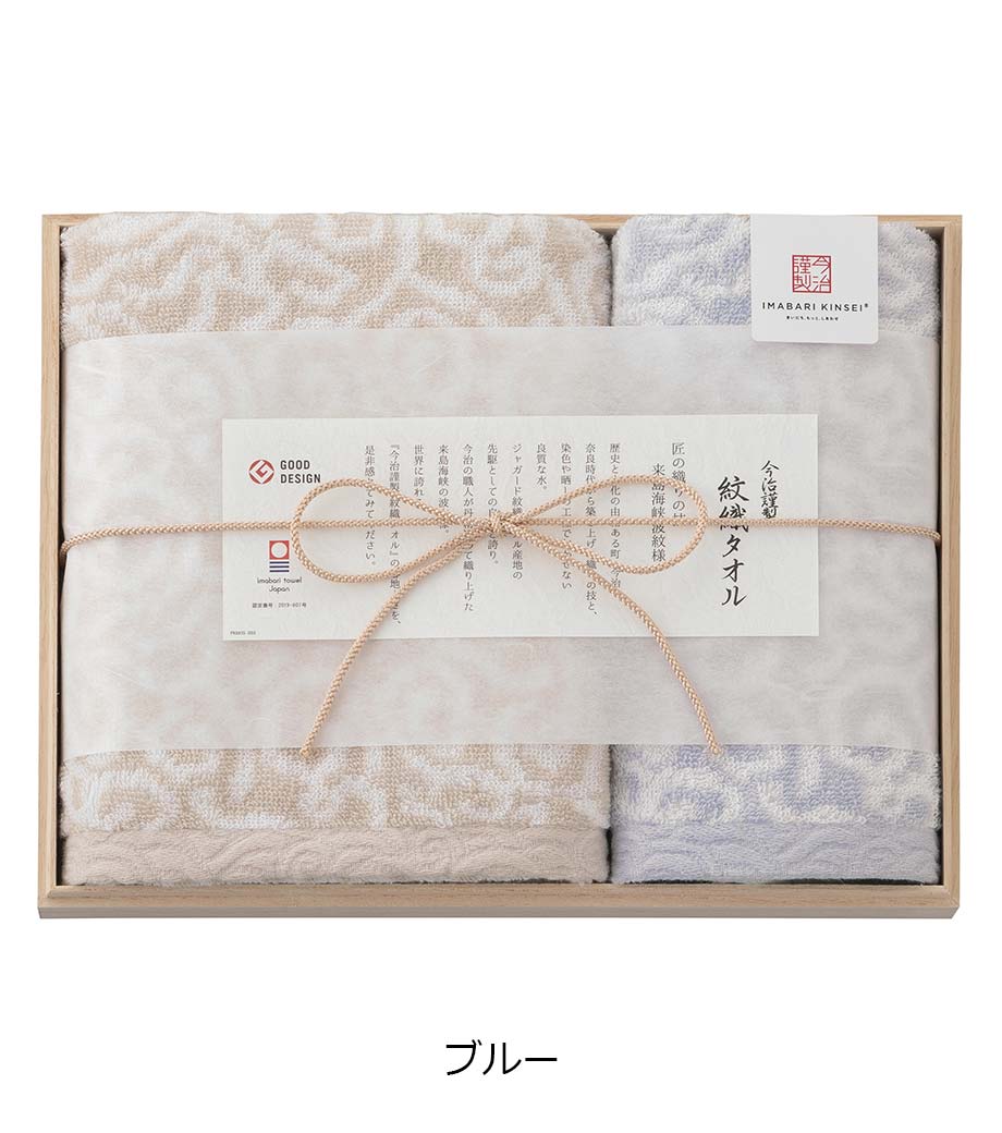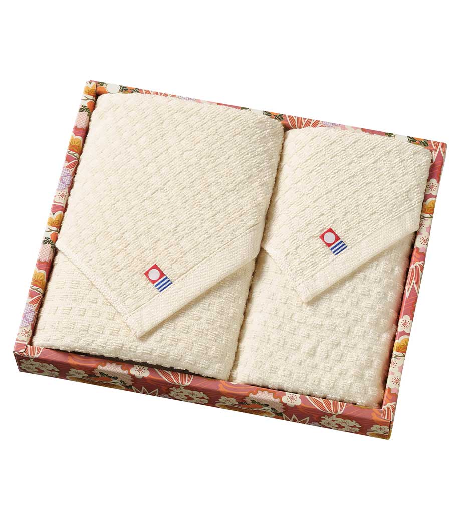 日本最大のタオル産地として知られる「今治」製の、フェイスタオルとウォッシュタオルのセット。瀬戸内海の穏やかな波や来島海峡の渦をモチーフにしたジャガード織が、上質な存在感を放ちます。高級感漂う木箱に収められており、大切な方へ感謝の気持ちを丁寧に伝える贈り物として最適です。