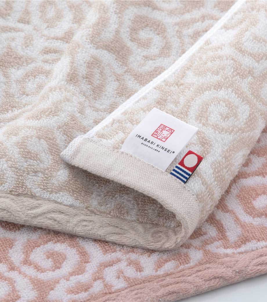 日本を代表するタオルの産地今治製の紋織タオル。毎日使えるフェイスタオルサイズです。縁起のいい和柄である唐草文様に、来島海峡の渦潮のイメージを落とし込んだジャガード織が美しいデザイン。柔らかいカラーリングの3色からお選びいただけます。木箱に収められており、感謝や敬意を届けたい場面にふさわしい贈り物です。
