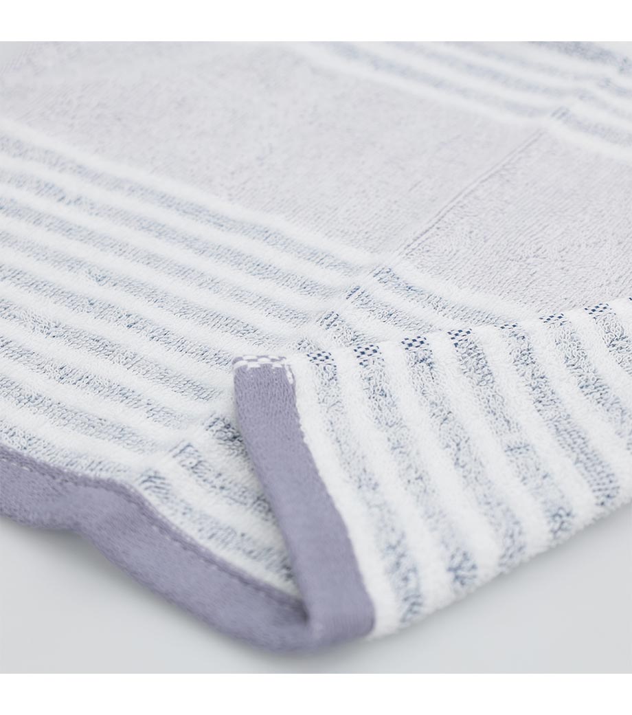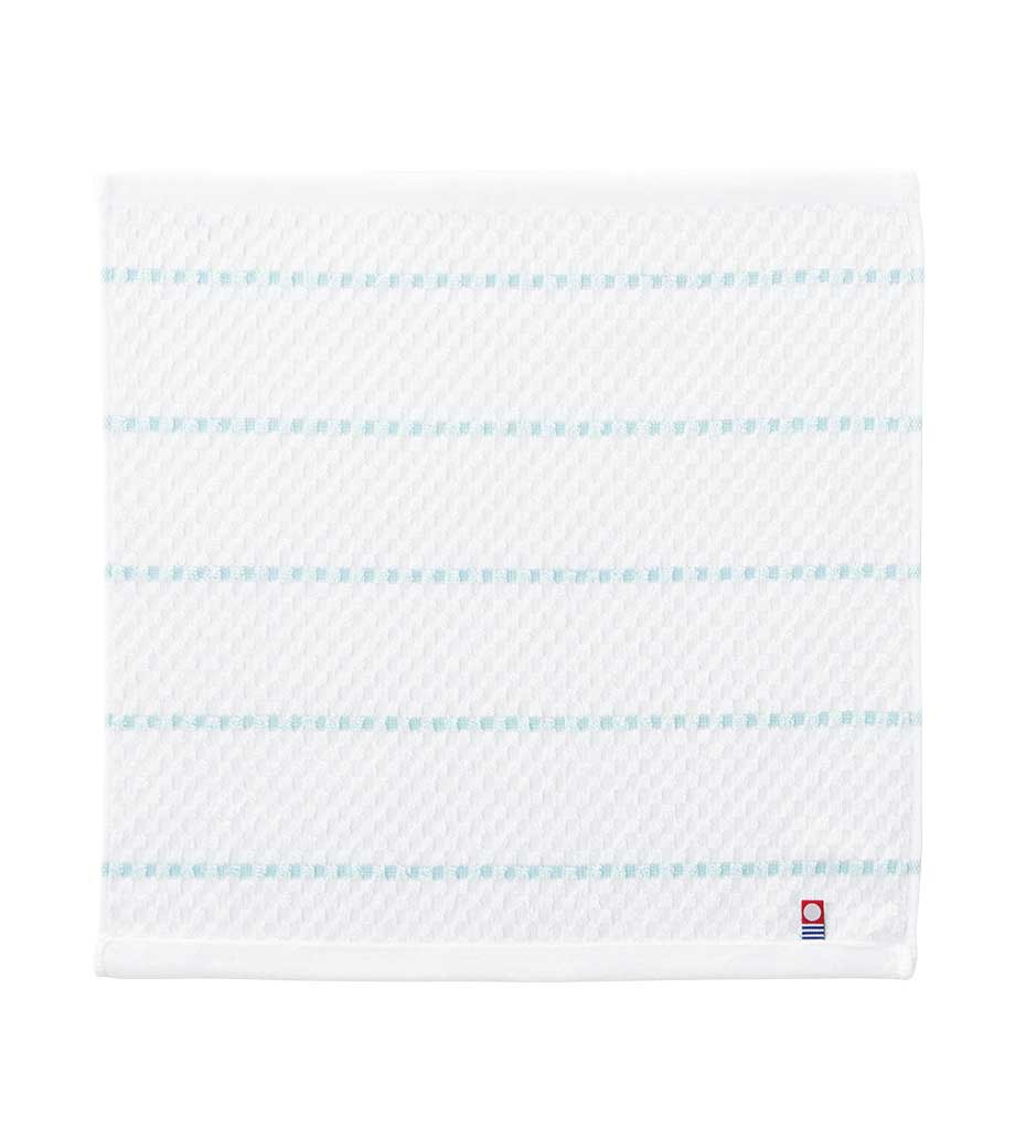 タオル産業の本場として知られる今治で作られた、安心品質のフェイスタオルです。爽やかなボーダー柄に加え、生地表面には市松のようなさりげない織り柄が入っています。日常使いしやすいシンプルさの中に、上品さも感じられるデザインです。