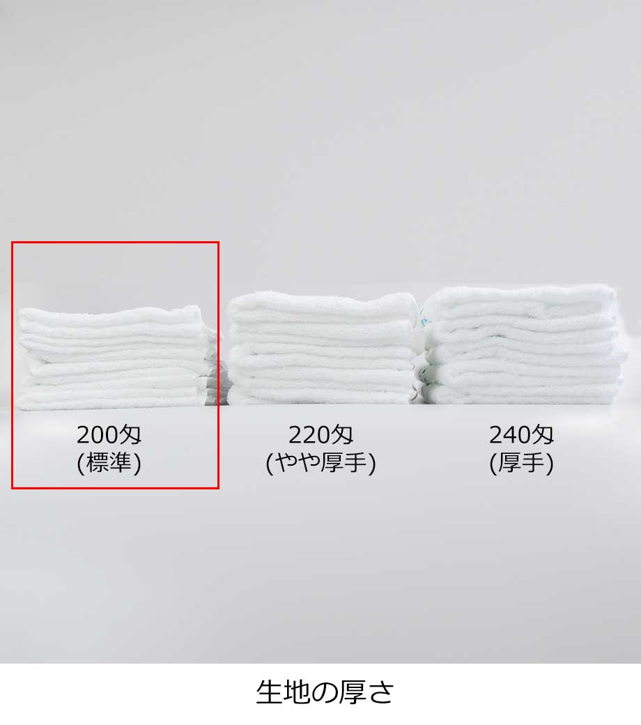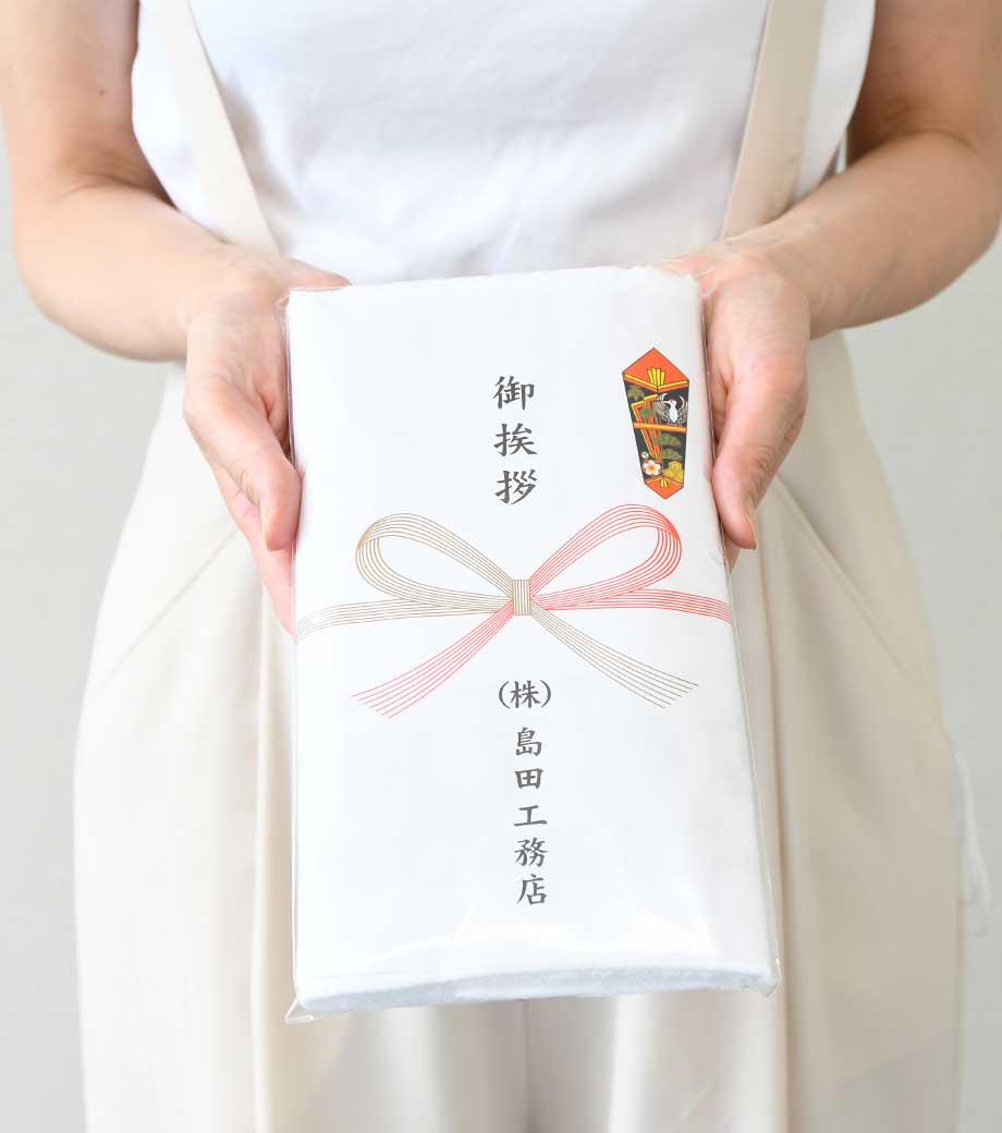 生地は「タオル産業発祥地」として有名な泉州産。タオルが織り上がった後で不純物などを取り除く「後晒し製法」です。おろしたてでも吸水性が良く清潔感もあります。標準的な厚みで、かさばりにくく持ち歩きやすい生地感です。のしを付けて年末年始や周年記念品、工事関係のご挨拶にいかがでしょうか。