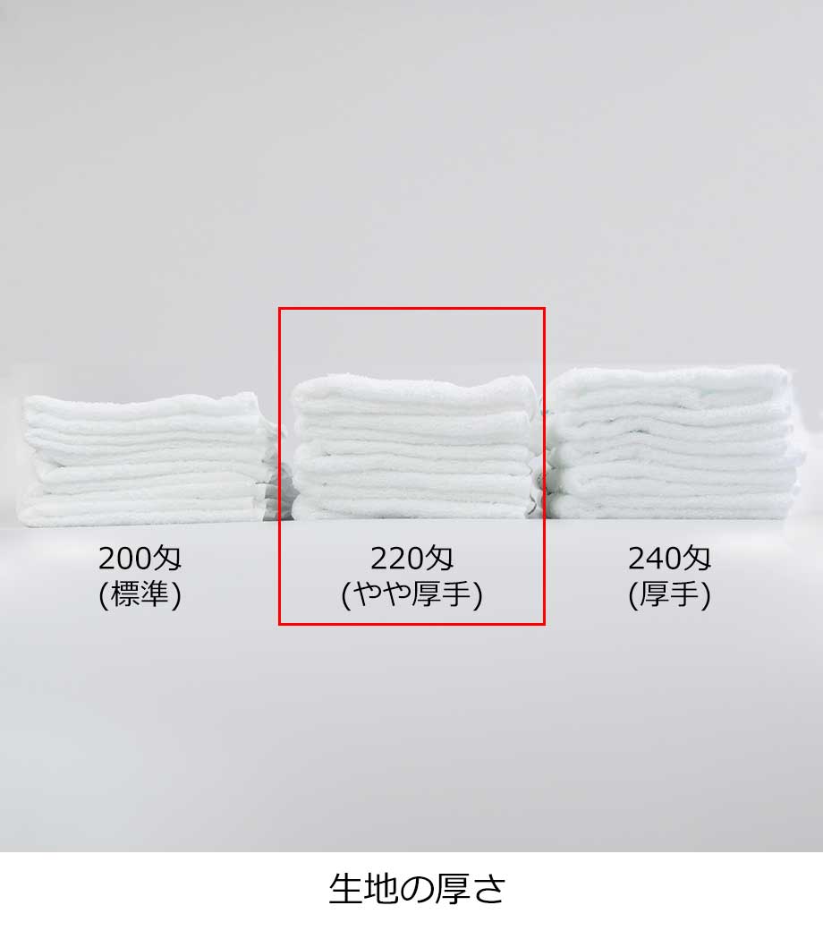【日本製】名入れタオル 220匁(やや厚手)は、お年賀やちょっとしたご挨拶用の粗品にピッタリなフェイスタオル。「タオル産業発祥地」として有名な泉州産です。やや厚みのある生地感で、のしを付けてお渡しするのにも安心の日本製クオリティ。おろしたてでも吸水性が良い「後晒し製法」で作られています。