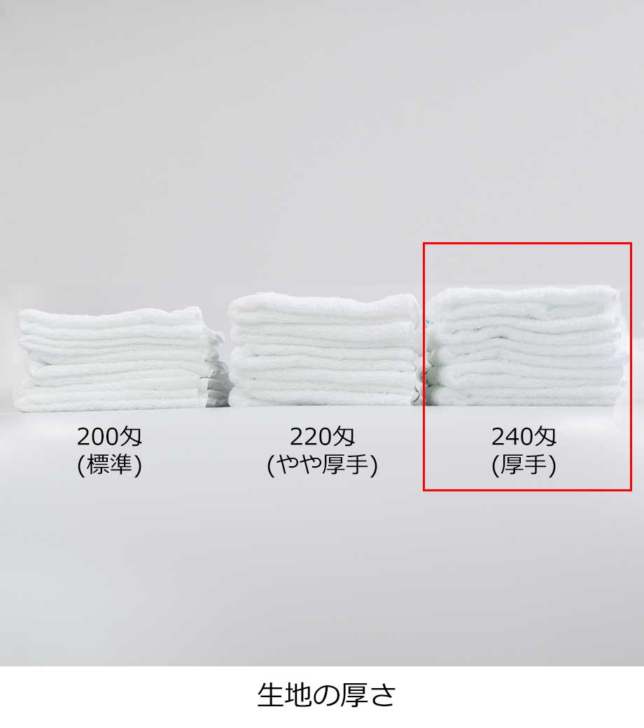 【日本製】名入れタオル 240匁(厚手)は、ふんわりとした肌触りでご挨拶用粗品にピッタリなフェイスタオル。お年賀や新規開拓の営業用など、シーズン問わず配布できる定番商品です。生地は「タオル産業発祥地」として有名な泉州産。おろしたてでも吸水性が良い「後晒し製法」で作られています。