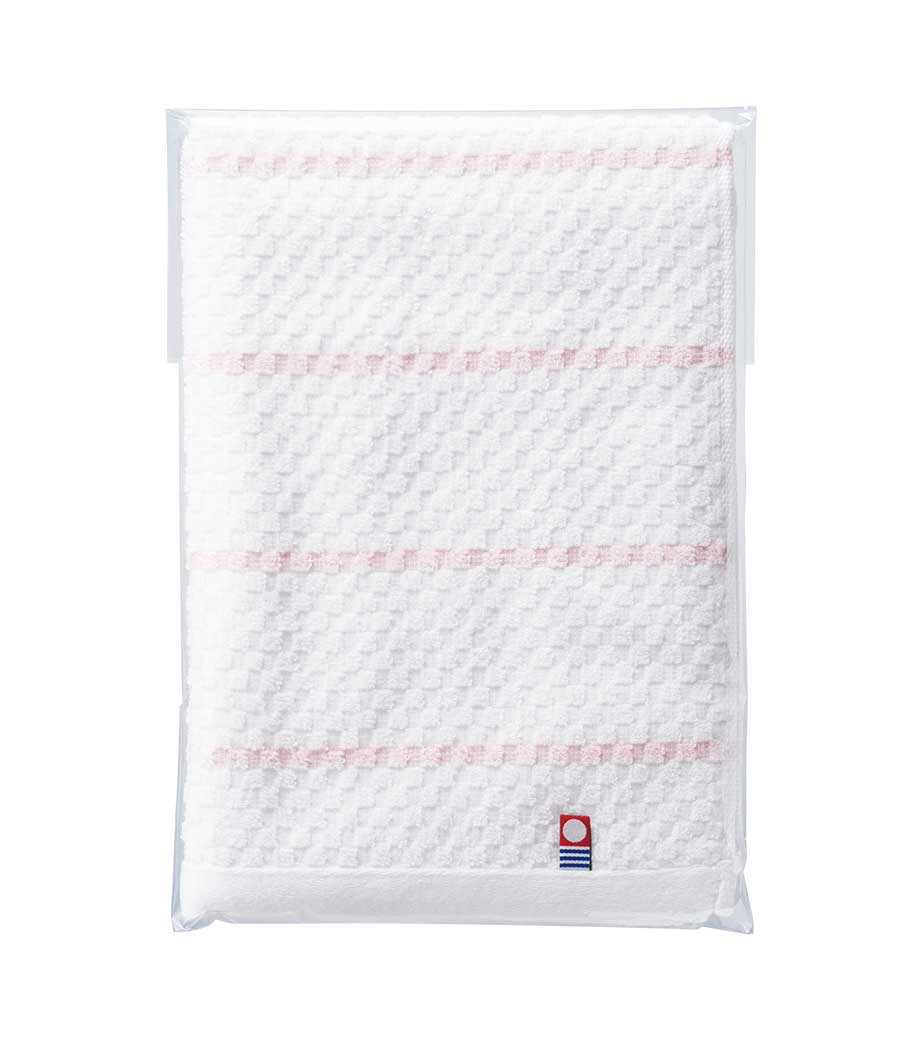 タオル産業の本場として知られる今治で作られた、安心品質のフェイスタオルです。爽やかなボーダー柄に加え、生地表面には市松のようなさりげない織り柄が入っています。日常使いしやすいシンプルさの中に、上品さも感じられるデザインです。