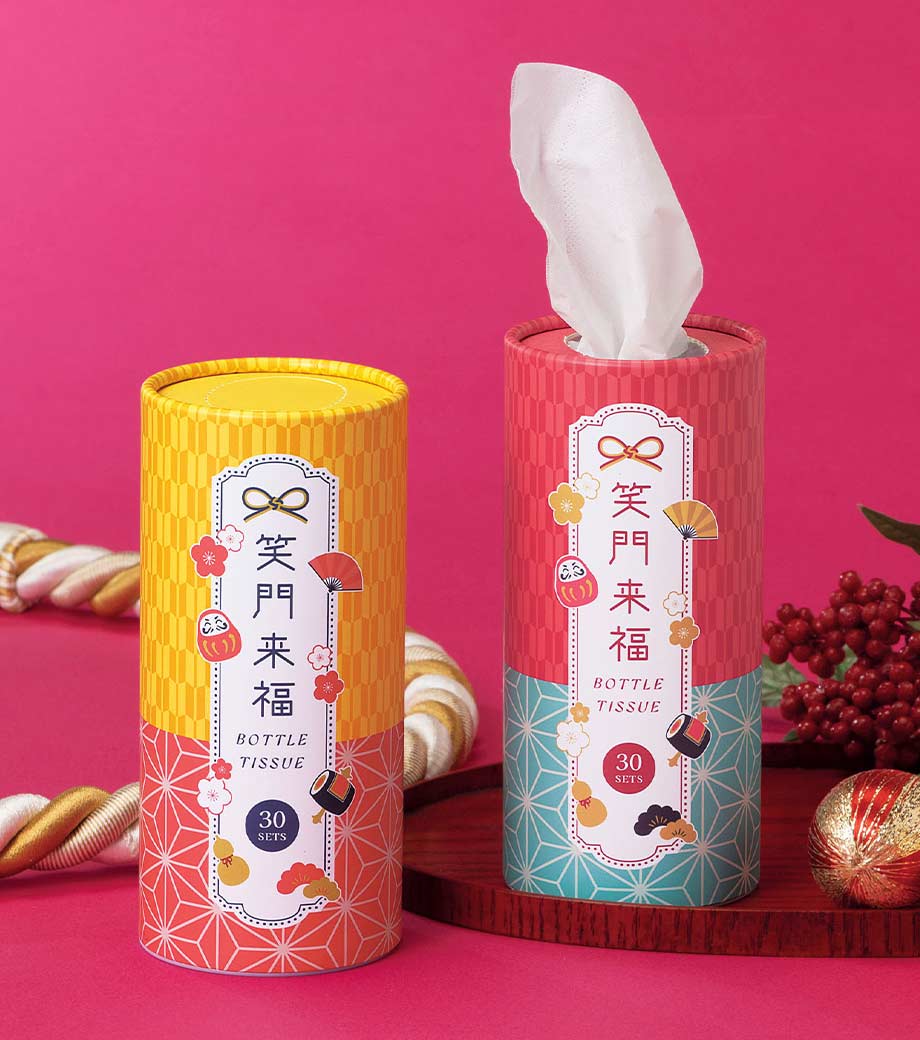華やかな和柄と「笑門来福」の四字熟語が縁起の良いボトル入りティッシュ。そのままお渡しできるパッケージで、年末年始のご挨拶粗品におすすめです。