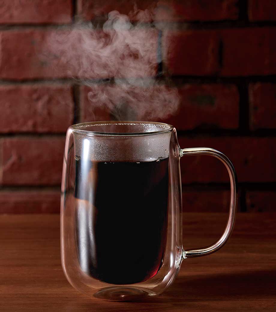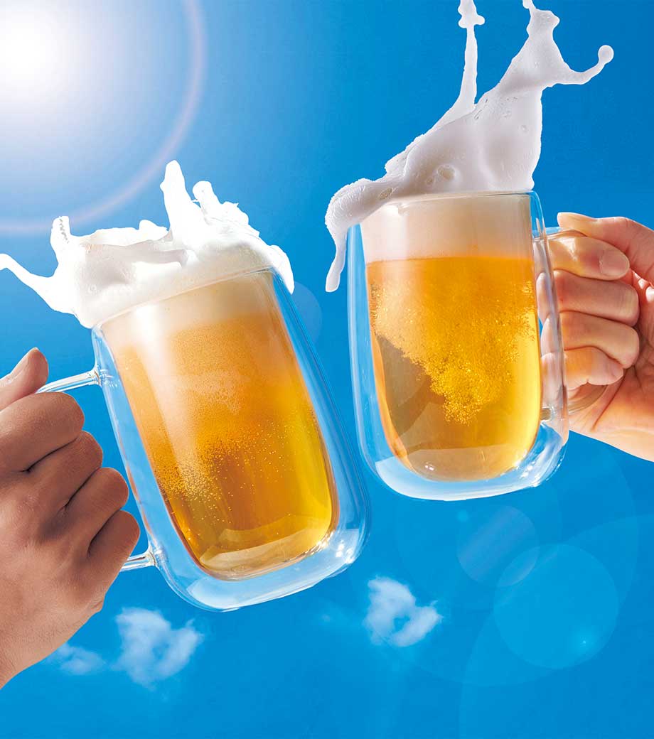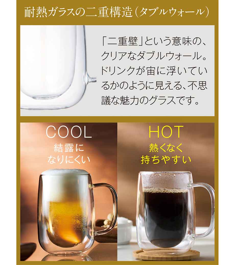 二重の耐熱ガラスでドリンクが宙に浮いているように見える!ジョッキタイプのグラスです。ビールなど冷たい飲み物だけでなく、ホットドリンクもOK!。容量は一般的な缶ジュース1本分と同じ約350ml。オフィスやお家でほっと一息に丁度良いサイズです。結露しにくく、テーブルを濡らさないのもうれしい。