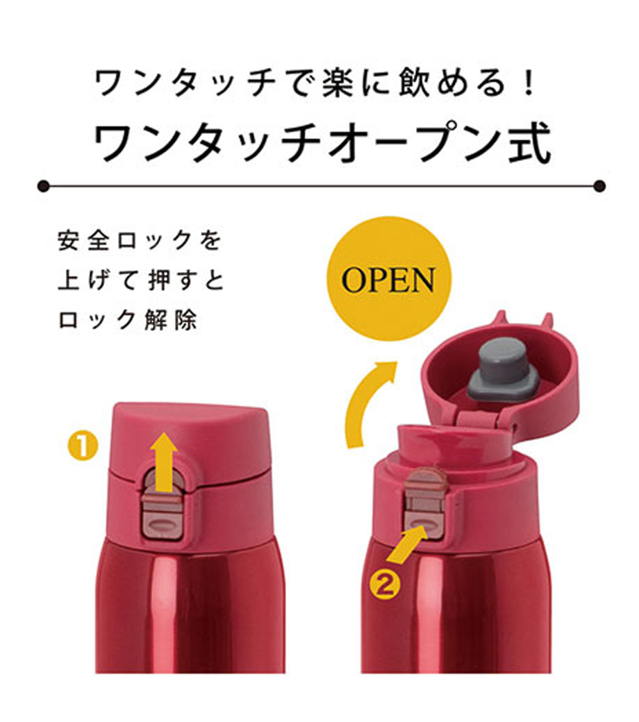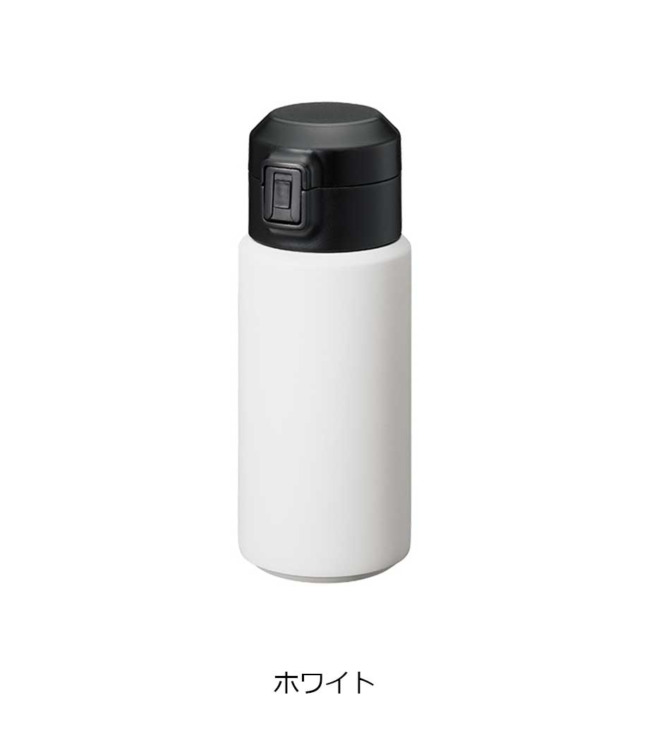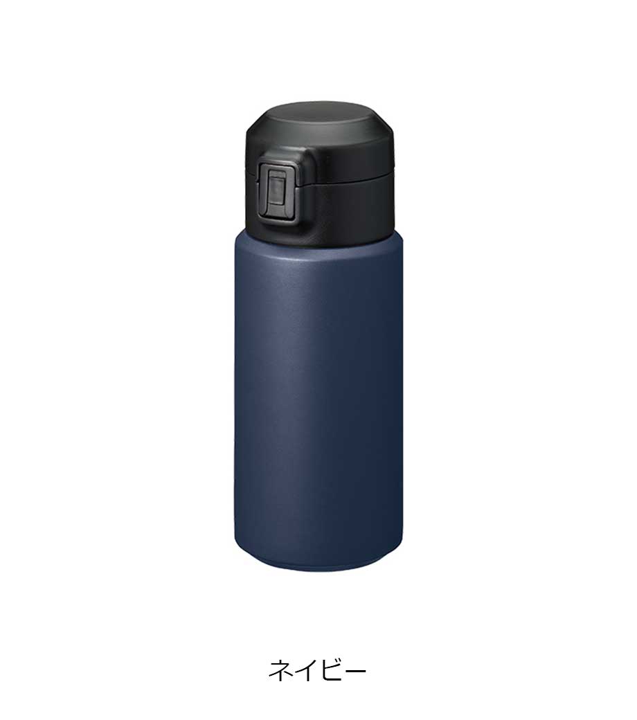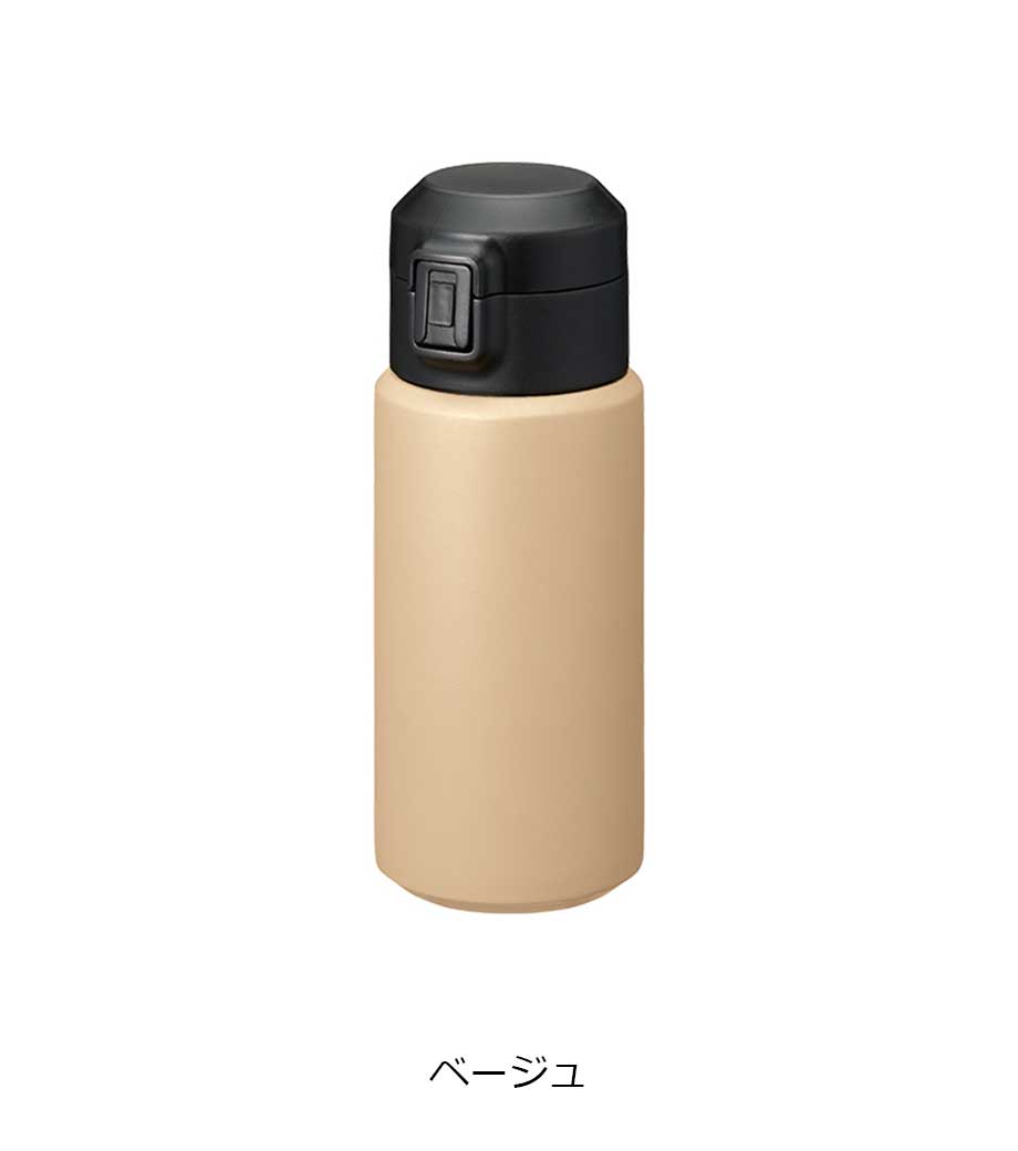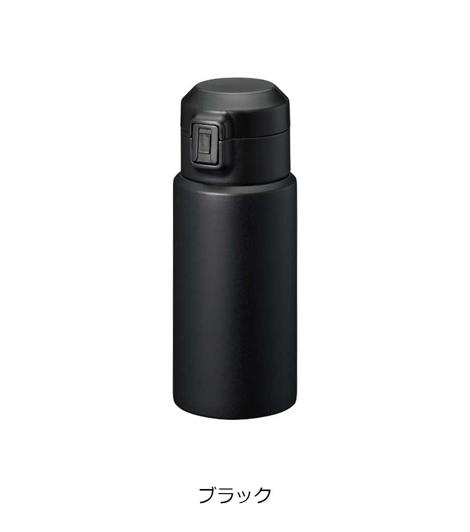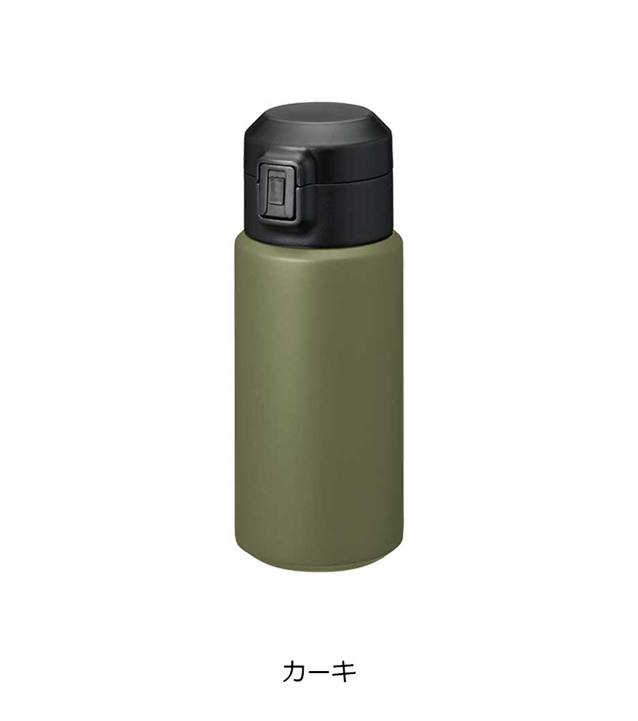 ワンタッチカービングサーモボトル360mlは、片方の手で簡単に開閉出来るワンタッチボトルです。口元にフィットする小さめの飲み口で、飲みやすい仕様。急いでいても水分補給できます。飲み口にロック機能付いているので安心してバッグに入れられます。