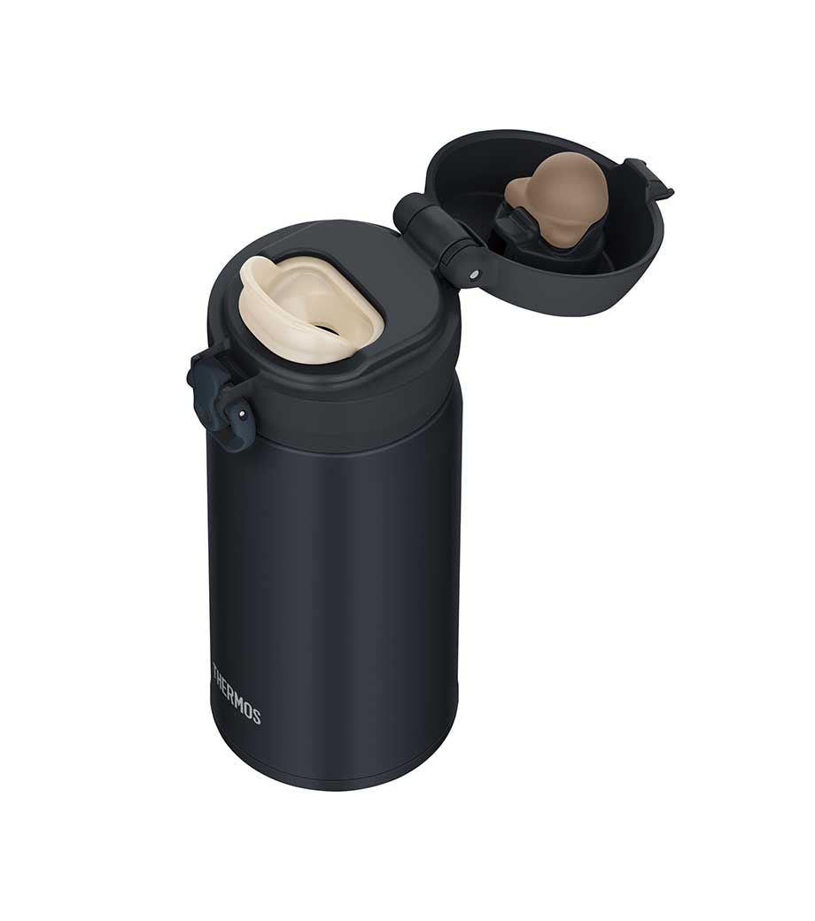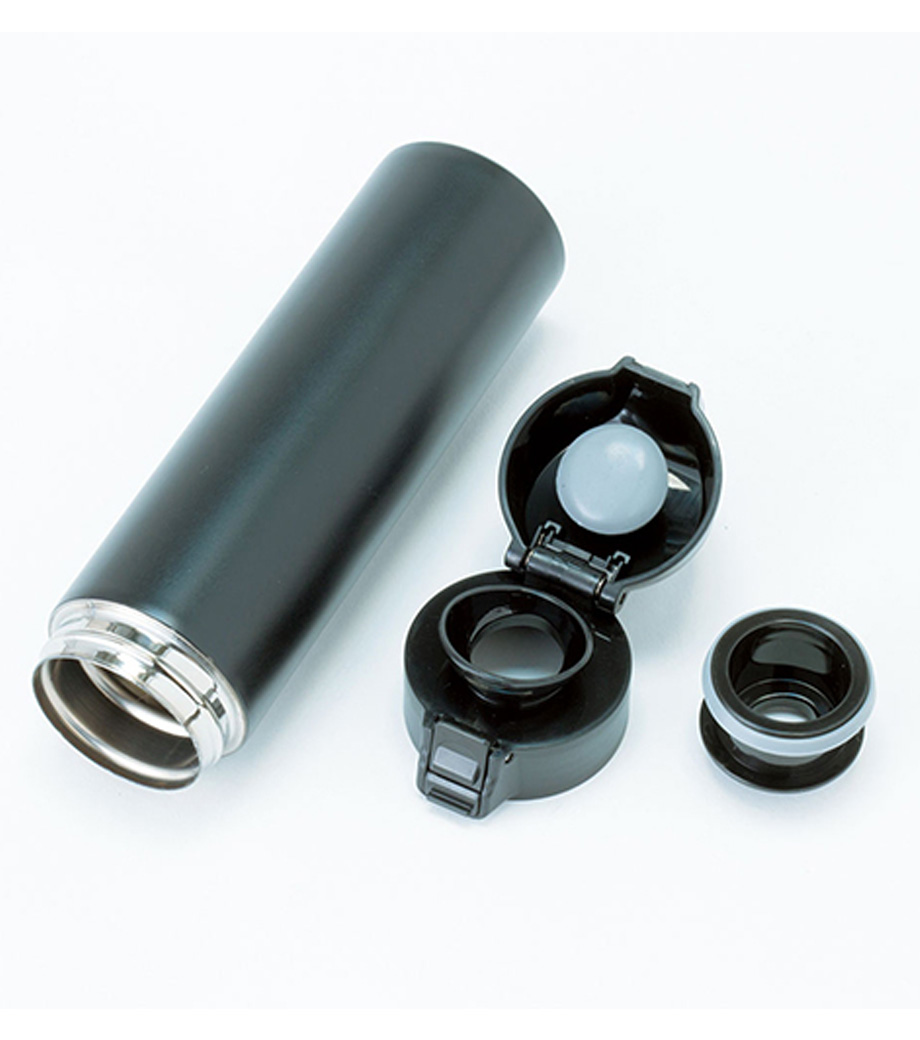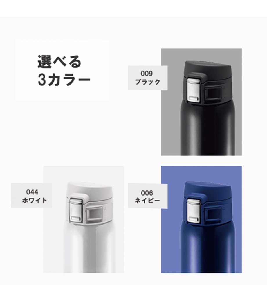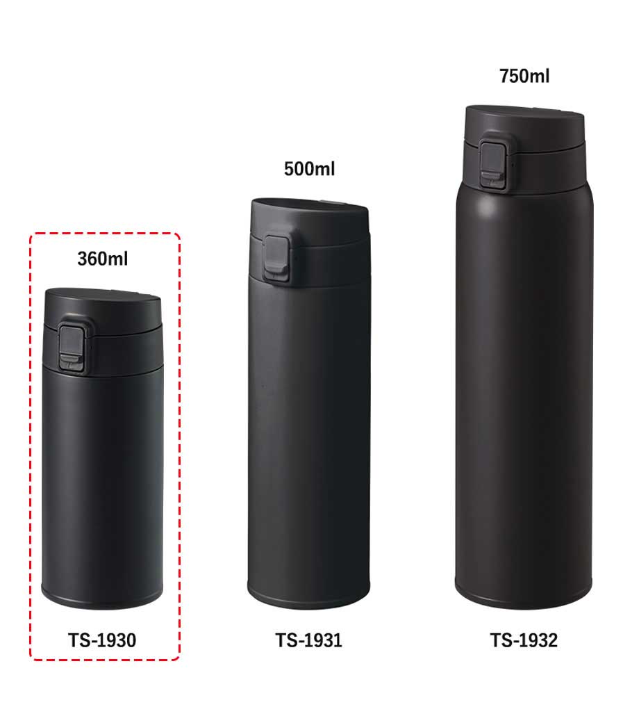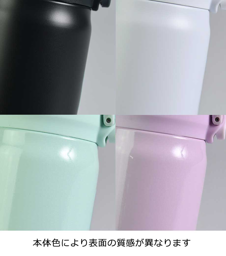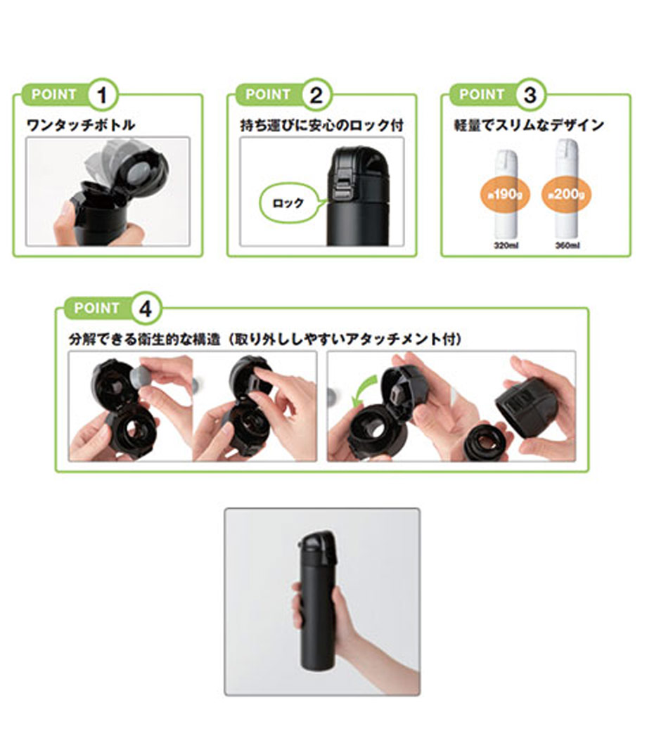 ワンタッチカービングサーモボトル360mlは、片方の手で簡単に開閉出来るワンタッチボトルです。口元にフィットする小さめの飲み口で、飲みやすい仕様。急いでいても水分補給できます。飲み口にロック機能付いているので安心してバッグに入れられます。