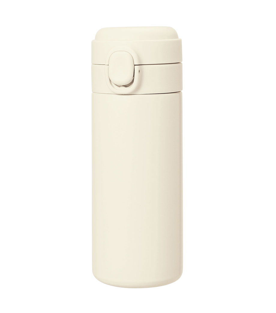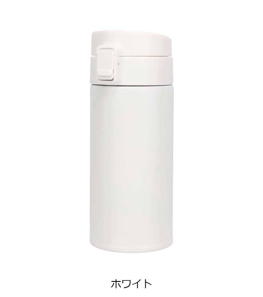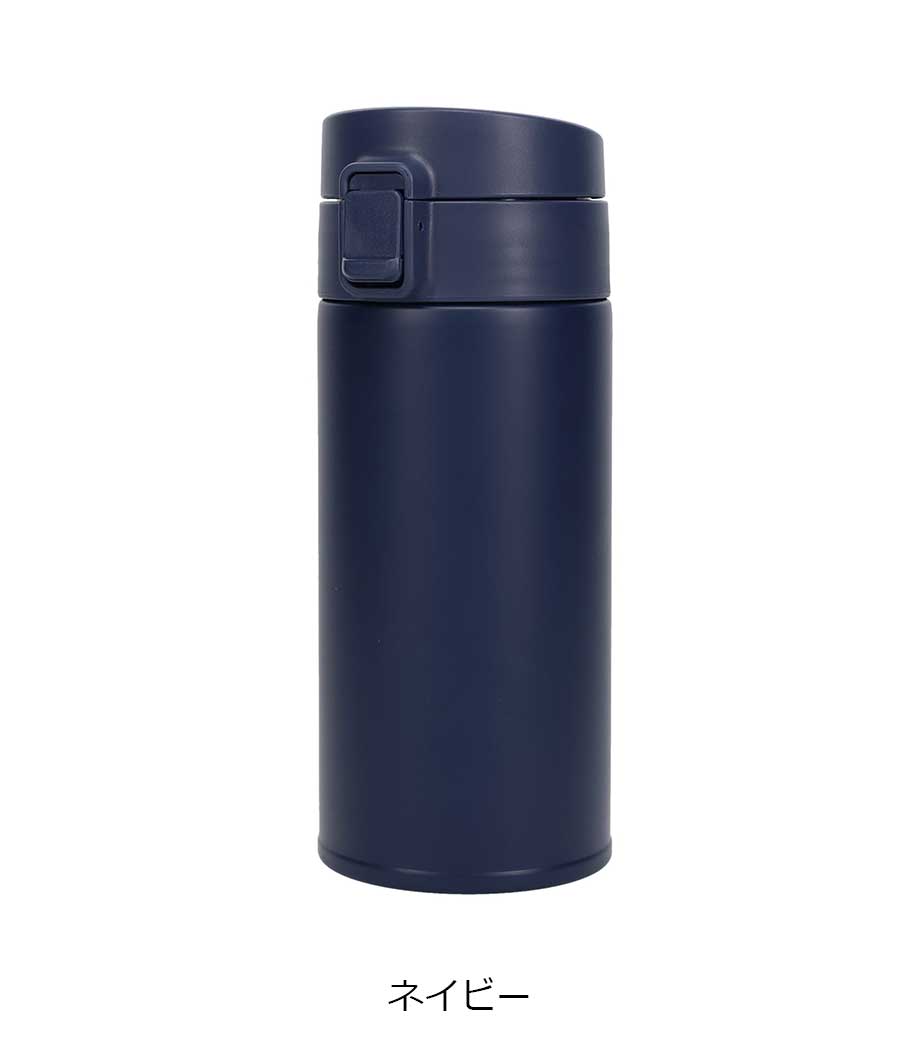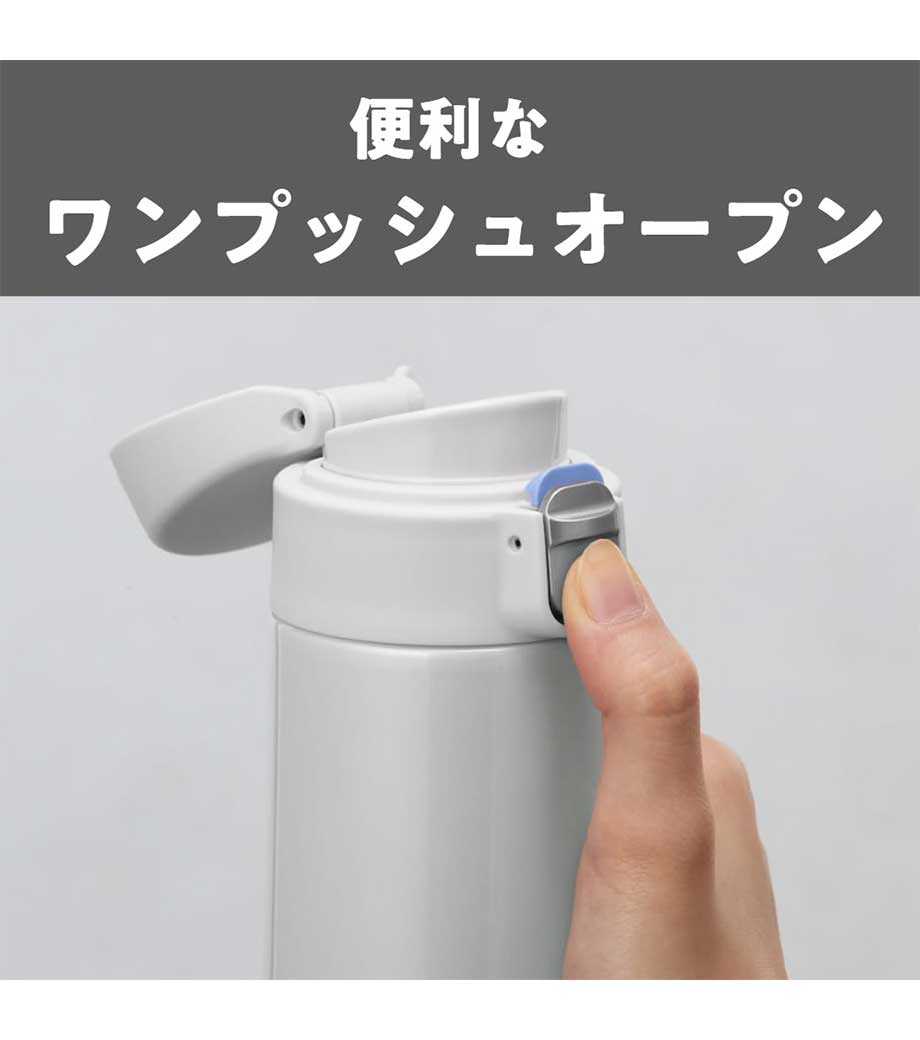 片手でポンっとラクに開けられる便利なステンレスボトルです。真空二重構造で飲み頃温度をキープしてくれます。フタが開かないようロック機能付きで、カバンの中でも安心。底にはすべり止め付きで滑りにくいのもうれしい。容量約300mlは、大きめの缶ジュースと同じくらいのサイズです。