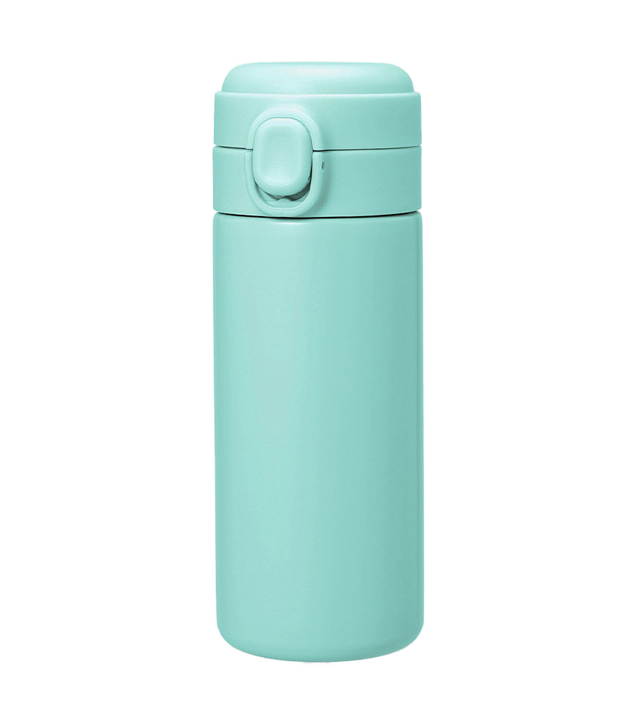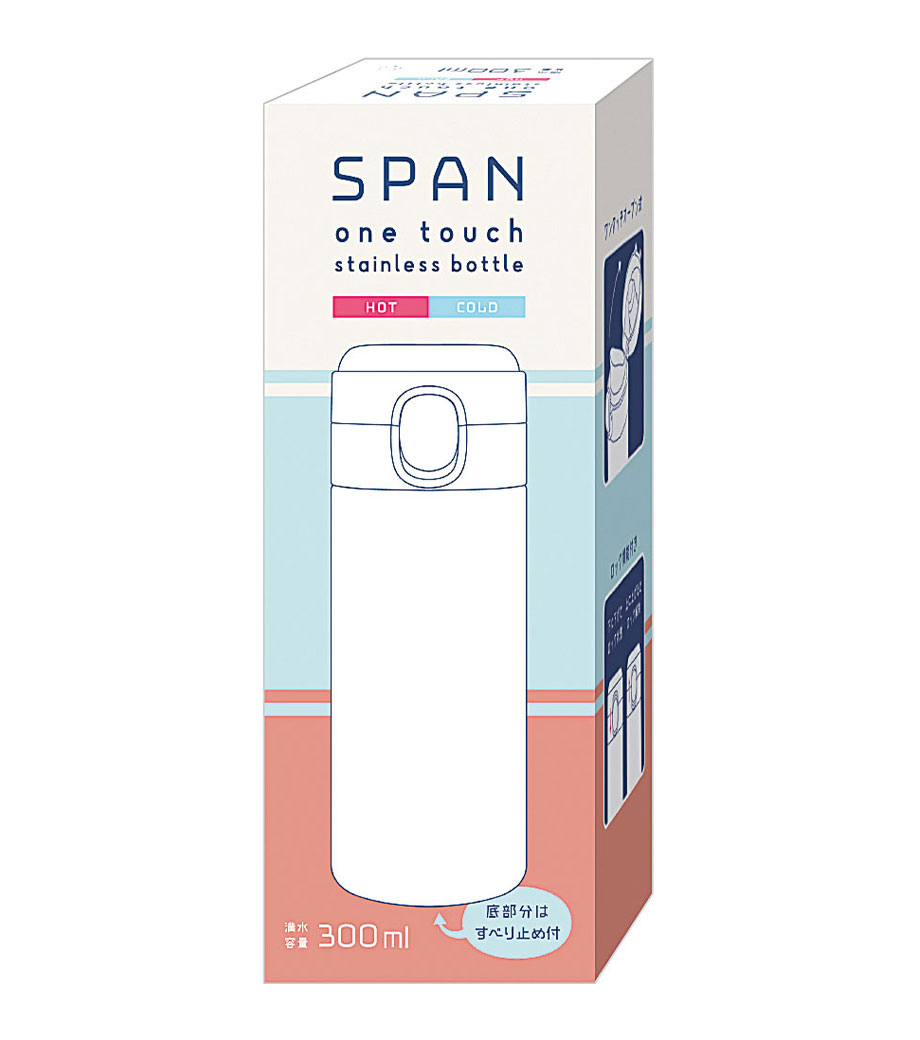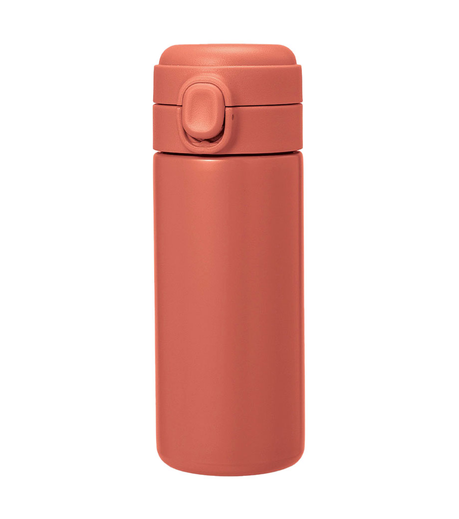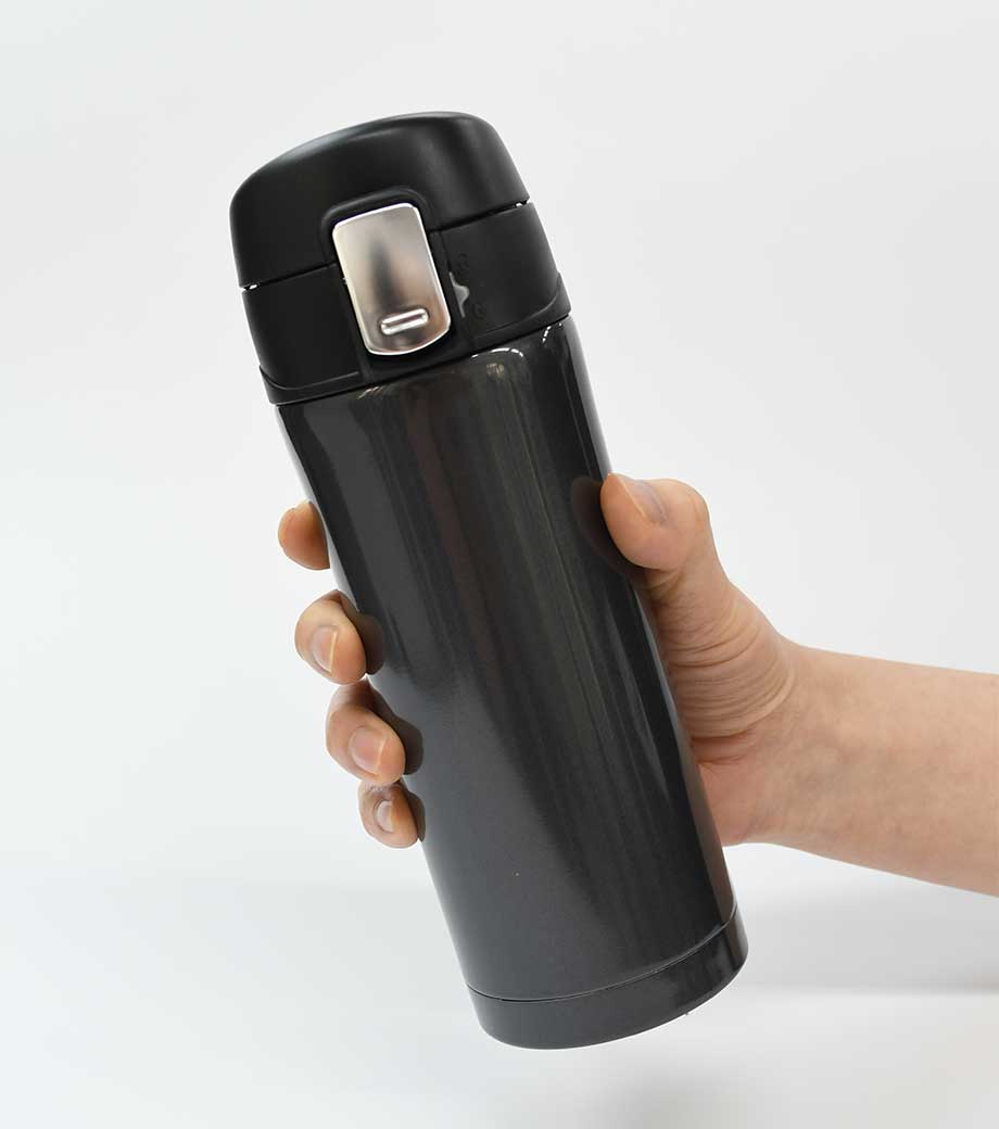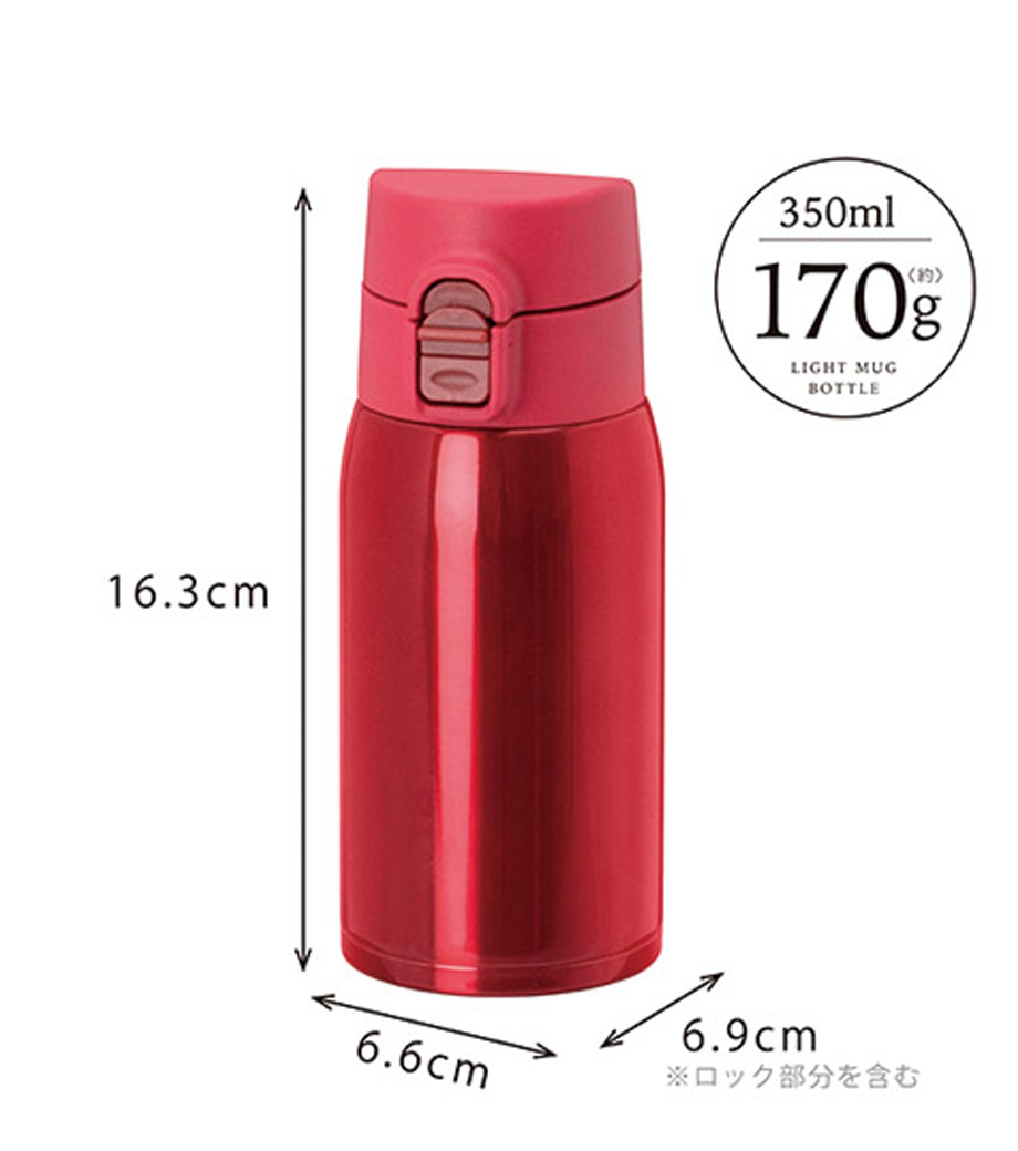 片手でポンっとラクに開けられる便利なステンレスボトルです。真空二重構造で飲み頃温度をキープしてくれます。フタが開かないようロック機能付きで、カバンの中でも安心。底にはすべり止め付きで滑りにくいのもうれしい。容量約300mlは、大きめの缶ジュースと同じくらいのサイズです。