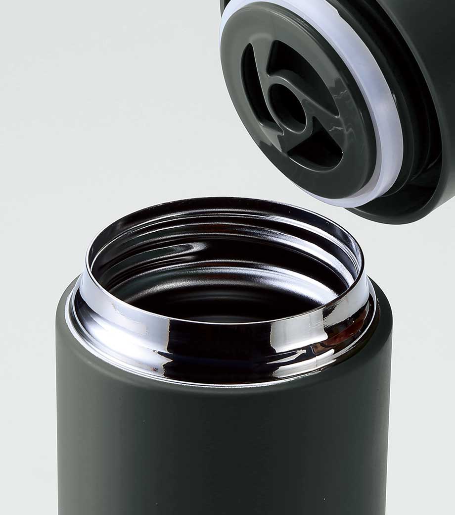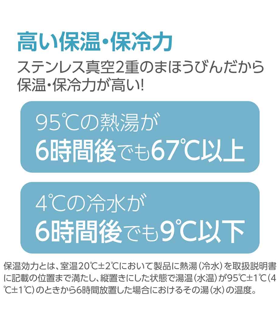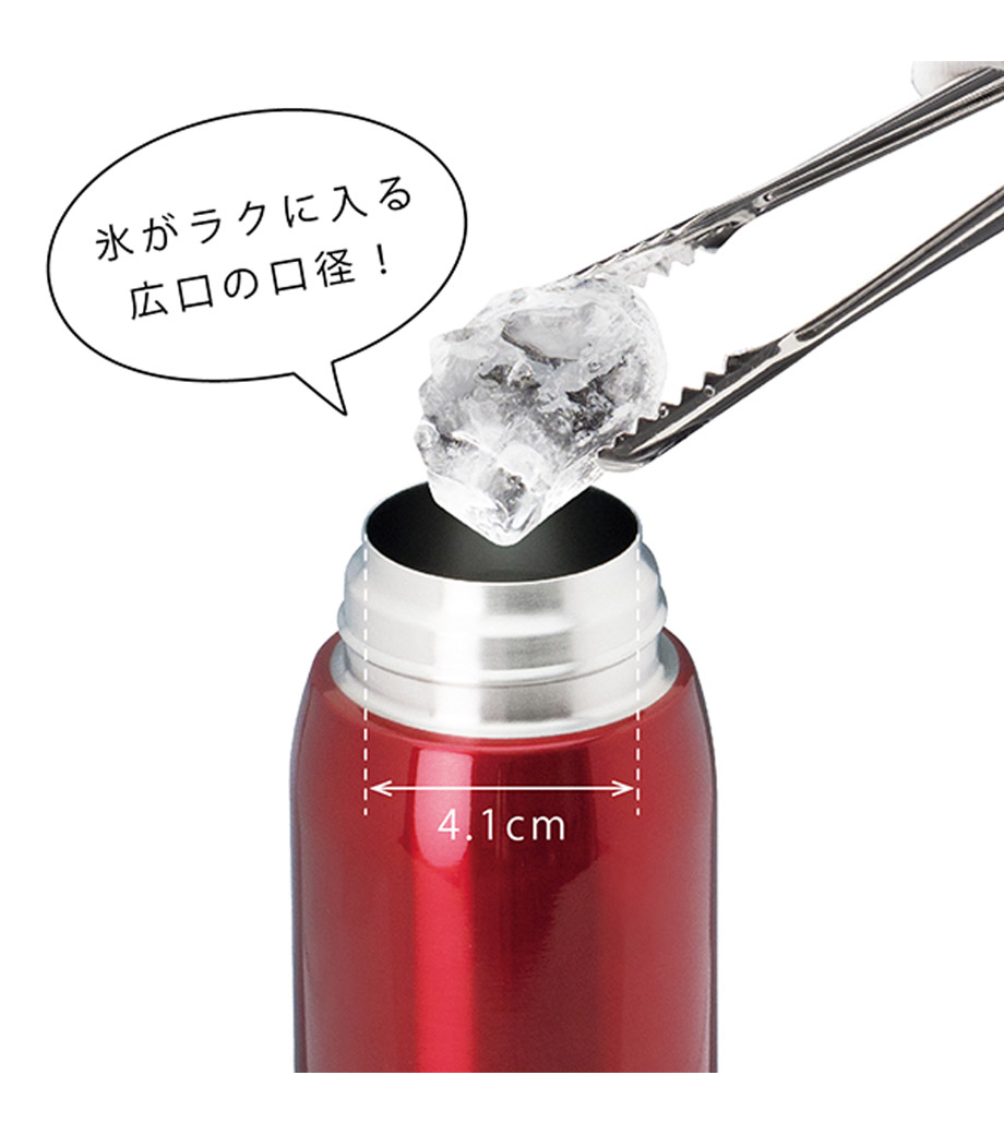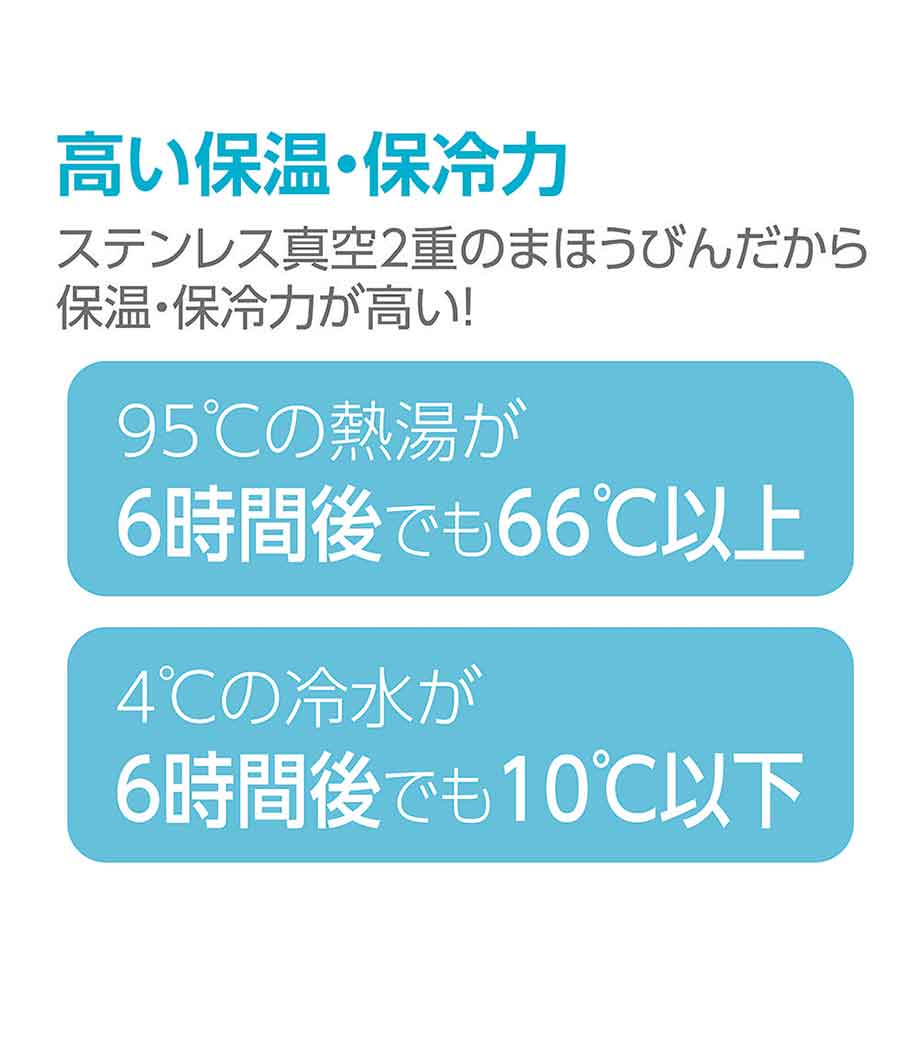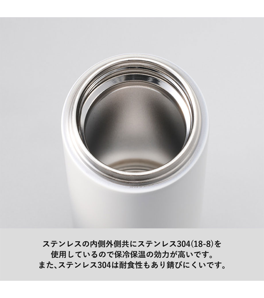 ステンレス製の真空サーモボトルで保冷温効果が高く、温かいものは温かく、冷たいものは冷たいまま持ち歩けます。