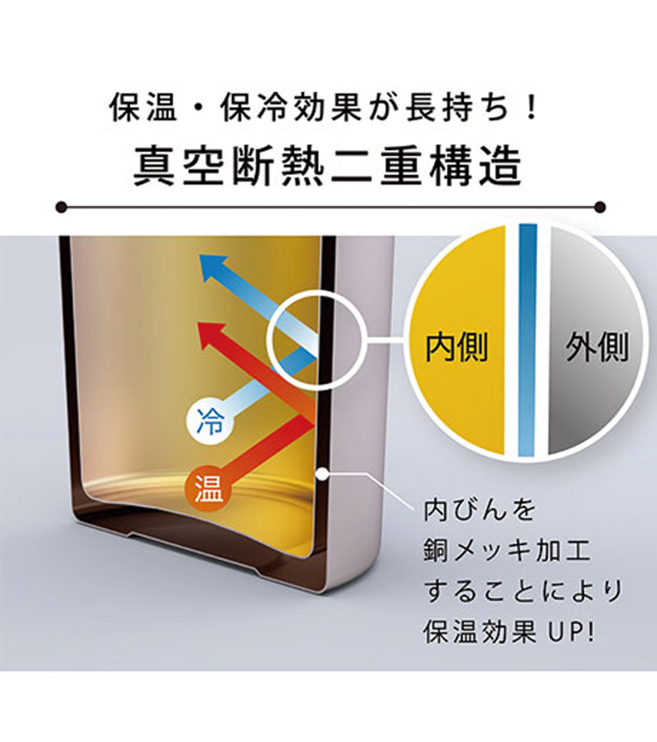 真空二重構造で保冷温効果抜群