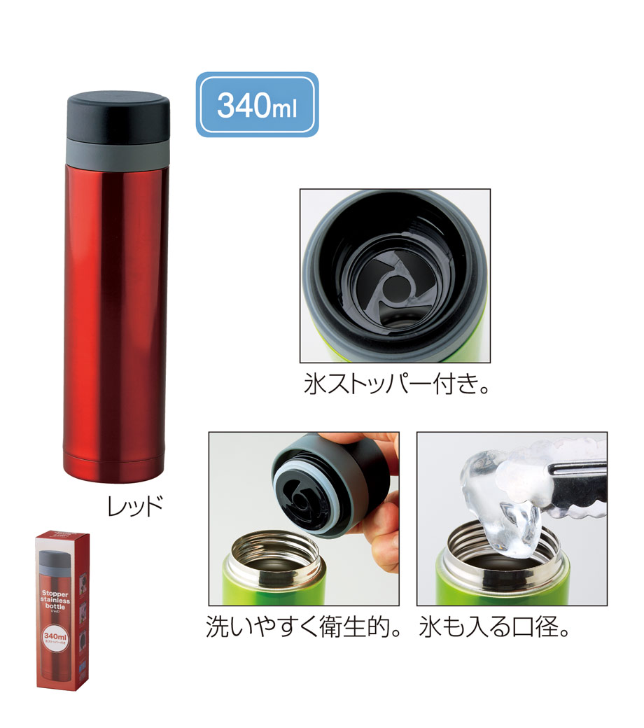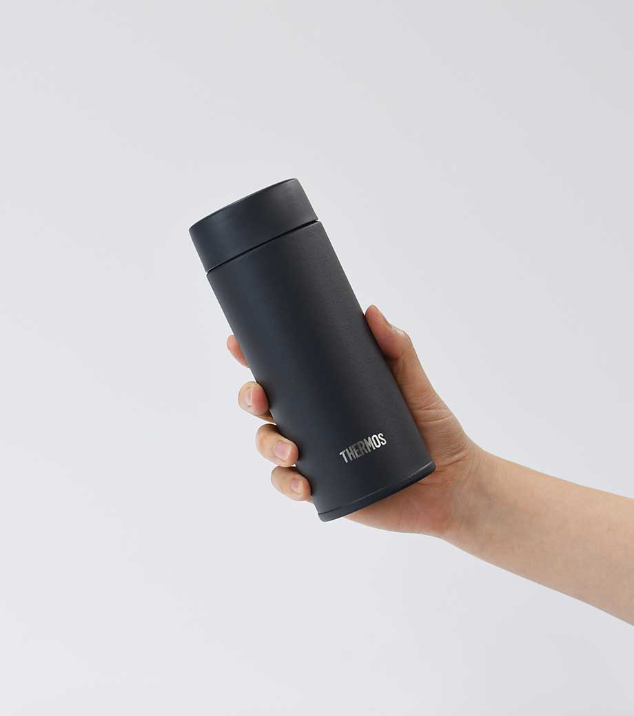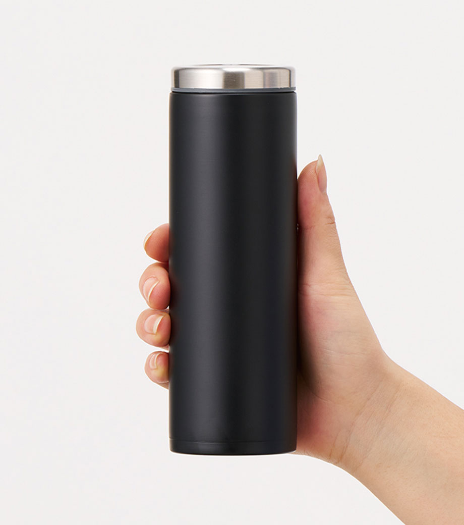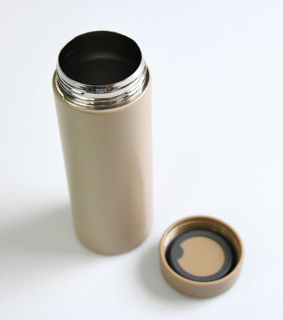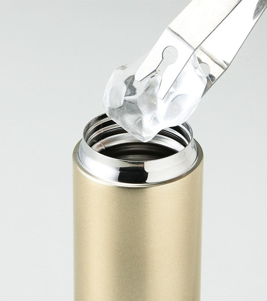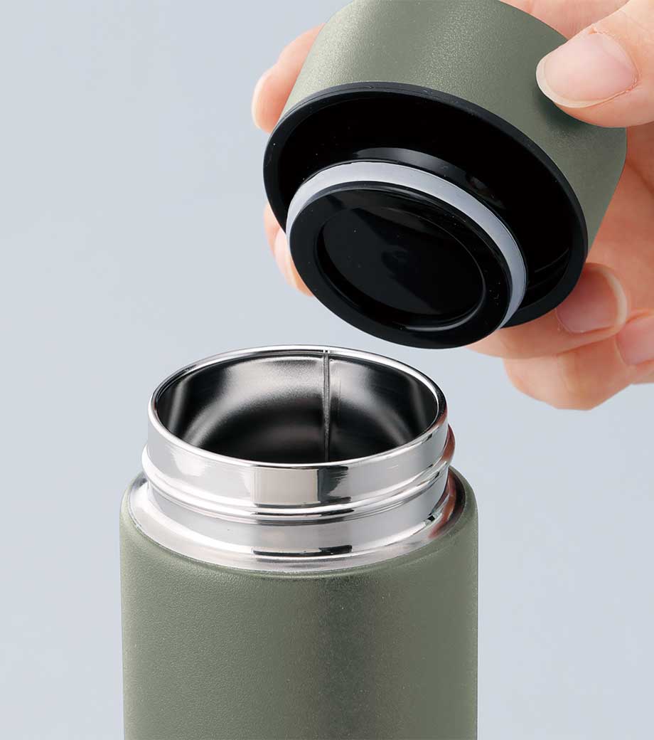小型の缶やペットボトル飲料がそのまま入る340mlの容量。真空ステンレスだから飲み物の保冷温もバッチリで、JIS規格に基づく試験済みです。飲み口を外すと、氷も入る口径で機能的にも優れています。氷やティーバッグを抑えるストッパー付き。フタ、飲み口、本体は外して洗え衛生的です。