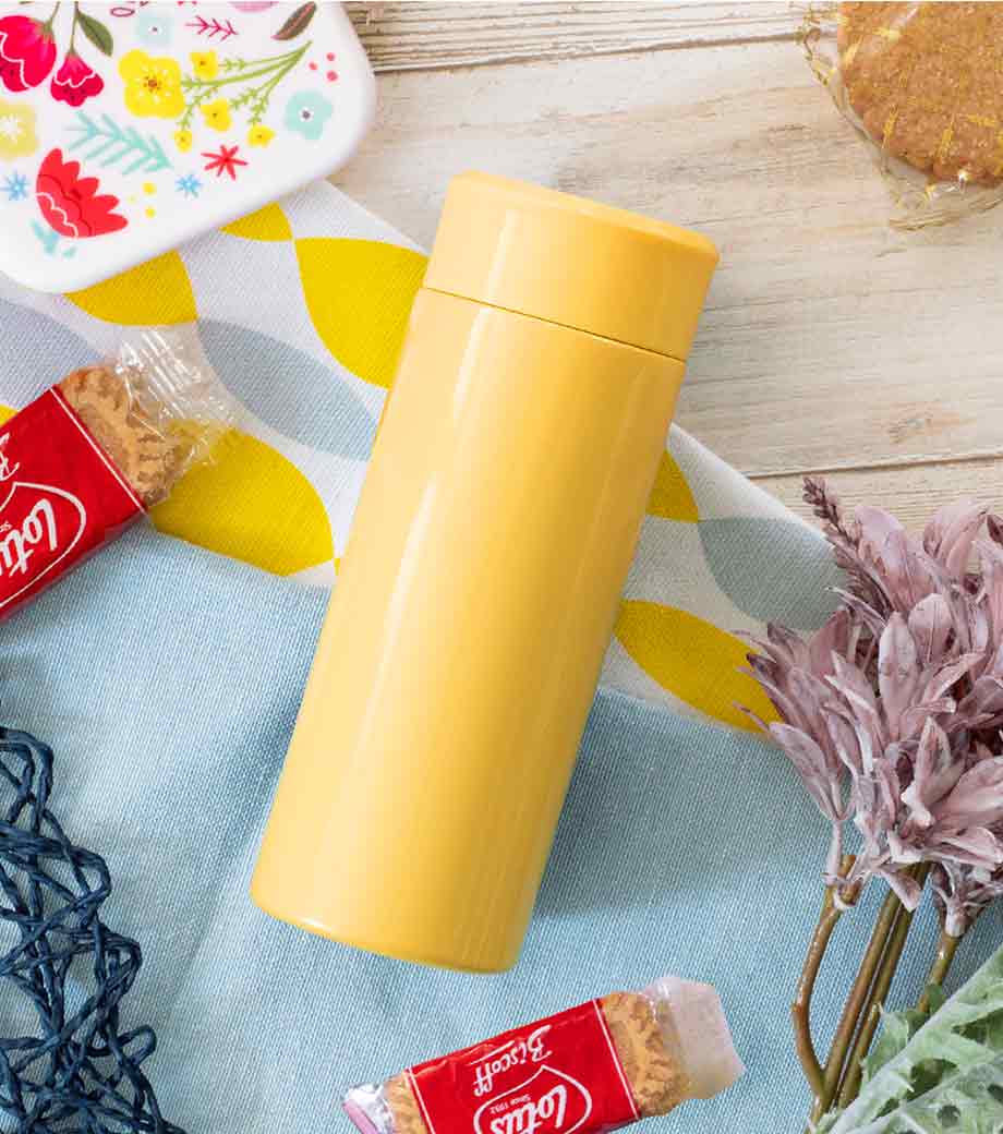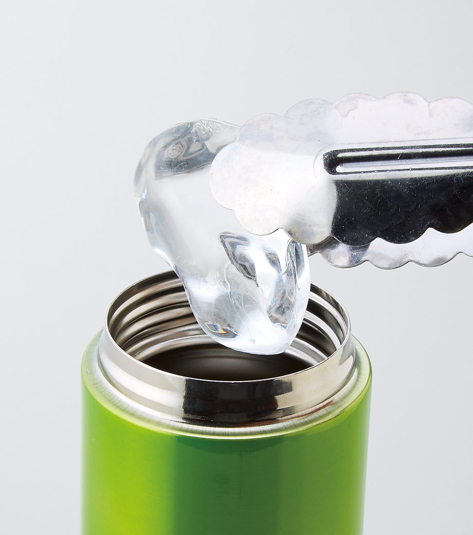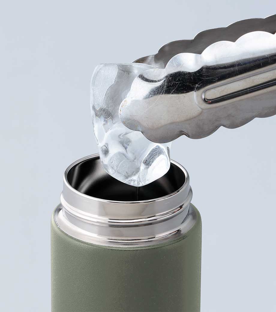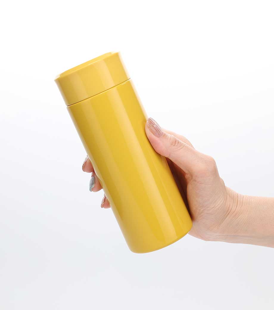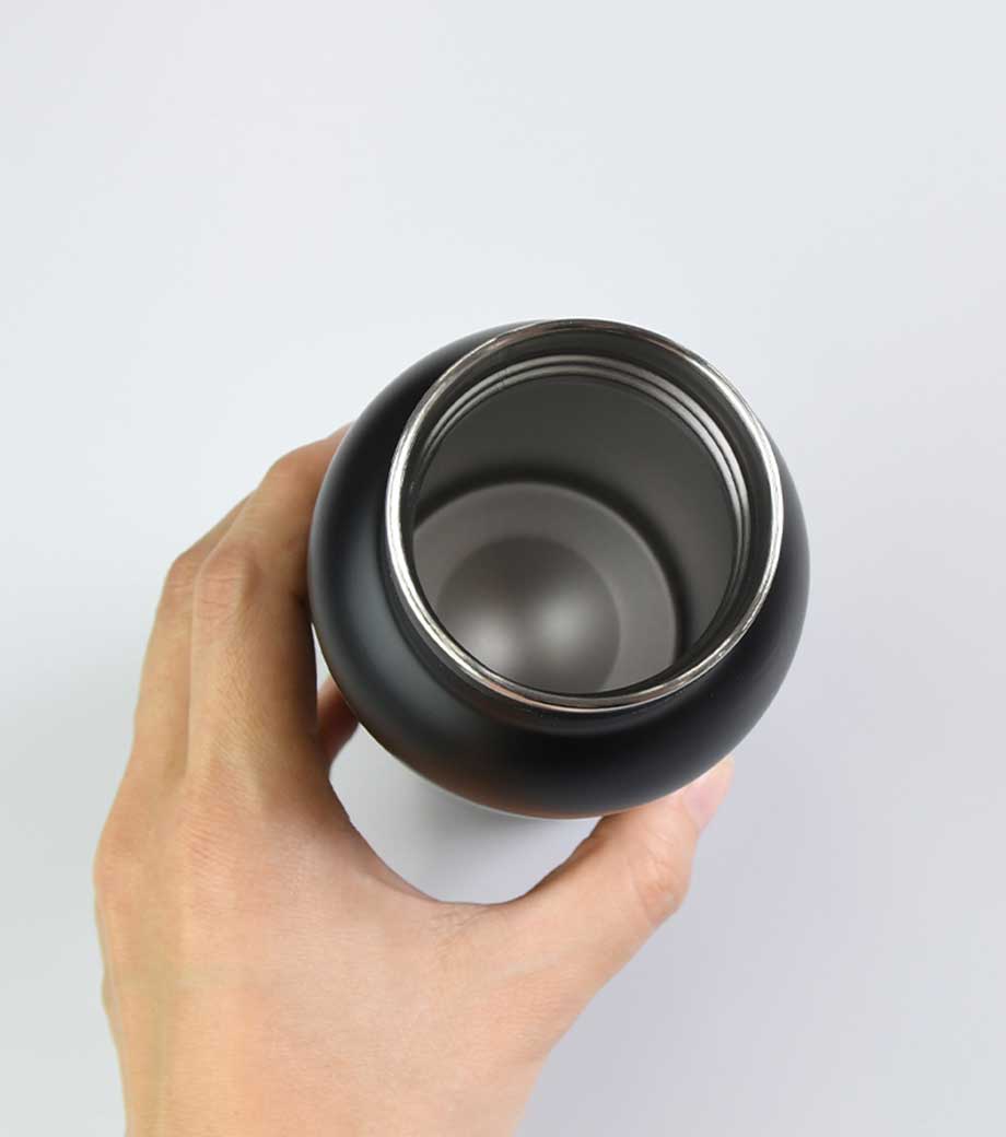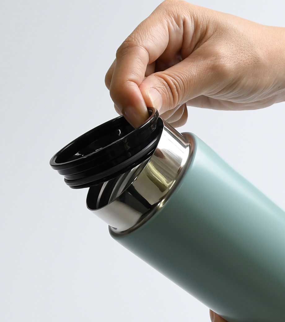 小型の缶やペットボトル飲料がそのまま入る340mlの容量。真空ステンレスだから飲み物の保冷温もバッチリで、JIS規格に基づく試験済みです。飲み口を外すと、氷も入る口径で機能的にも優れています。氷やティーバッグを抑えるストッパー付き。フタ、飲み口、本体は外して洗え衛生的です。