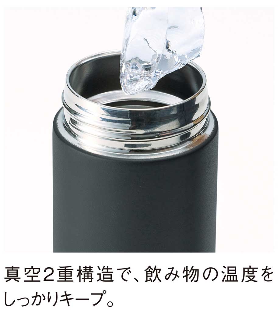 真空二重構造で飲み頃温度をしっかりキープしてくれるボトル。保冷・保温どちらも対応しているのでオールシーズン活躍します。樹脂素材の飲み口は優しい口当たりで、氷や熱い飲み物が勢いよく出るのを防ぐ氷ストッパー付き。通勤・通学にちょうど良い300mlサイズです。