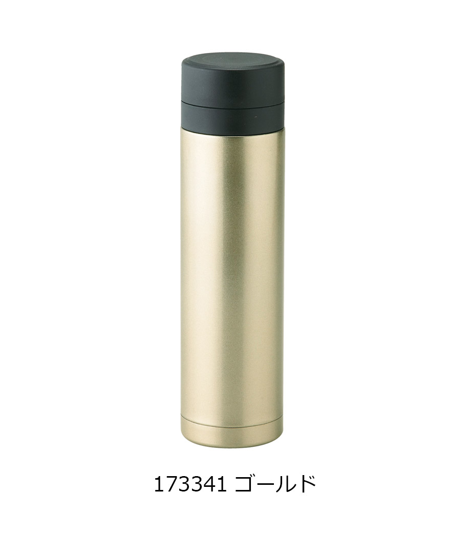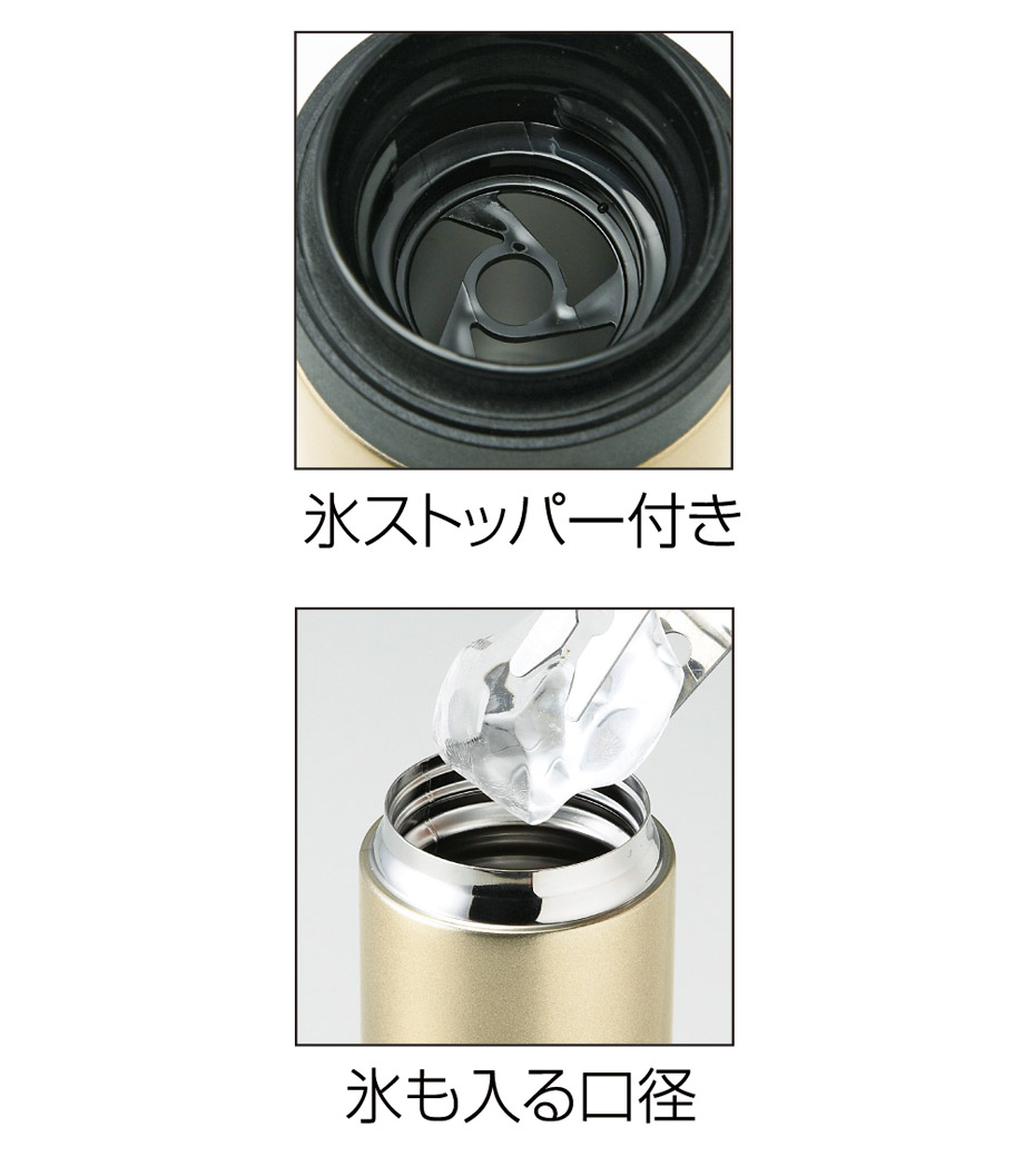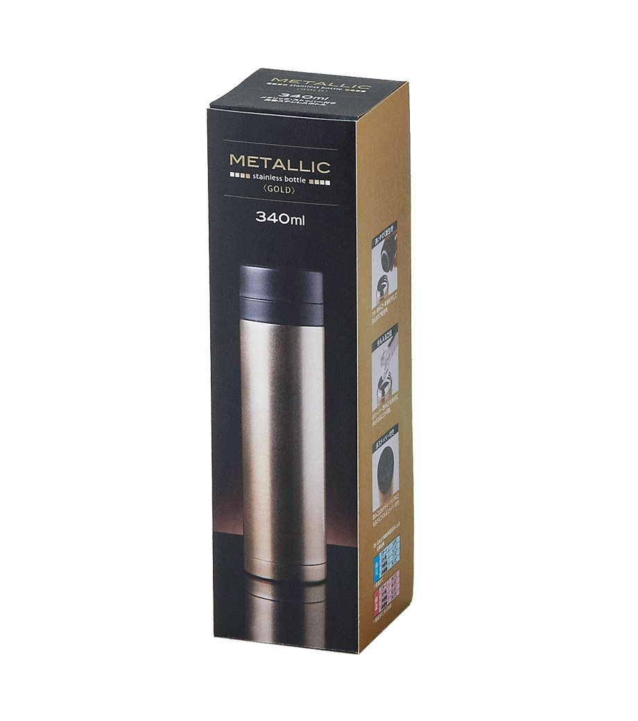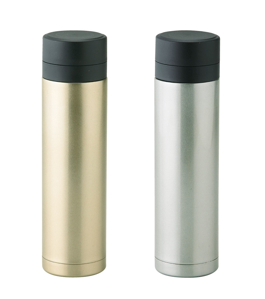 「メタリック・ストッパー付き真空ステンレスボトル」は、シンプルでありながら高級感あふれるゴールドとシルバーのカラーが素敵なステンレスボトルです。