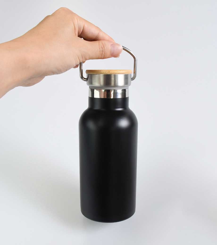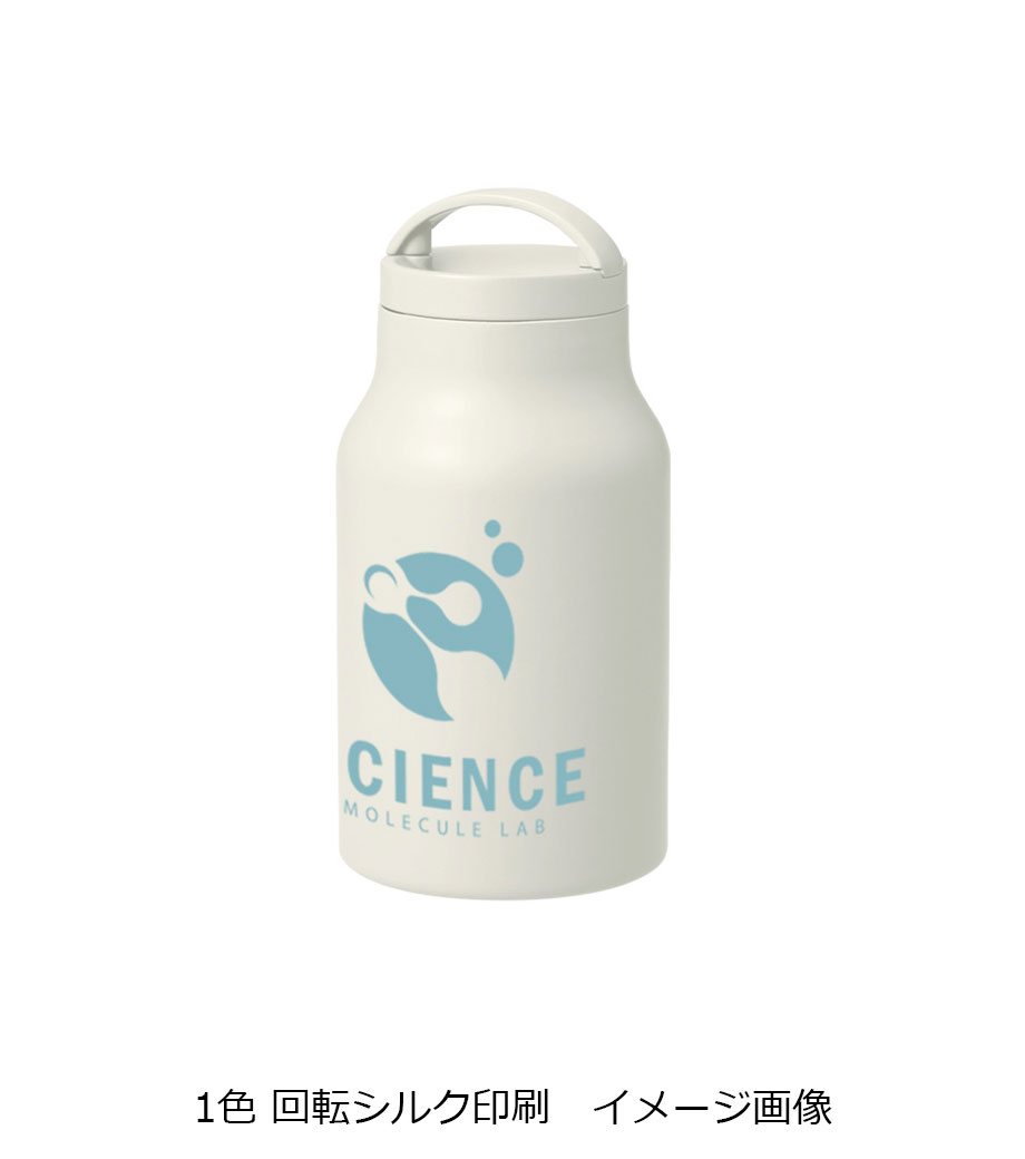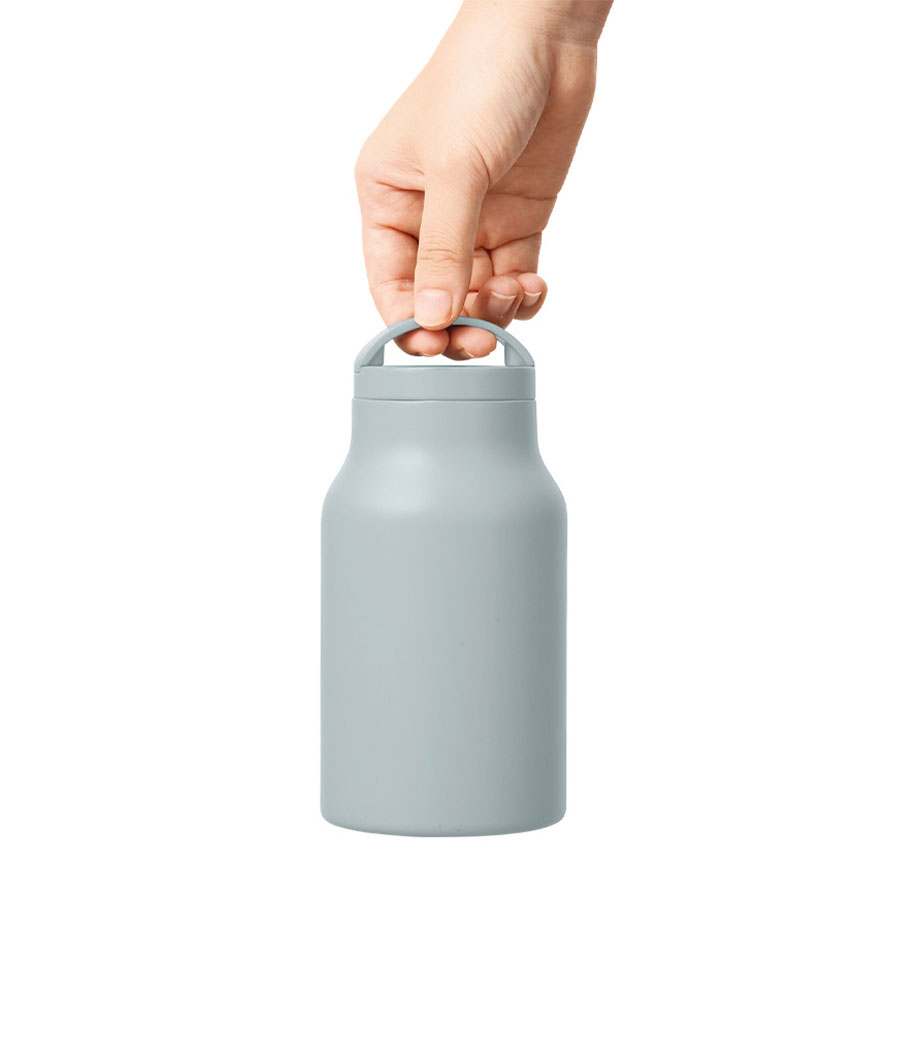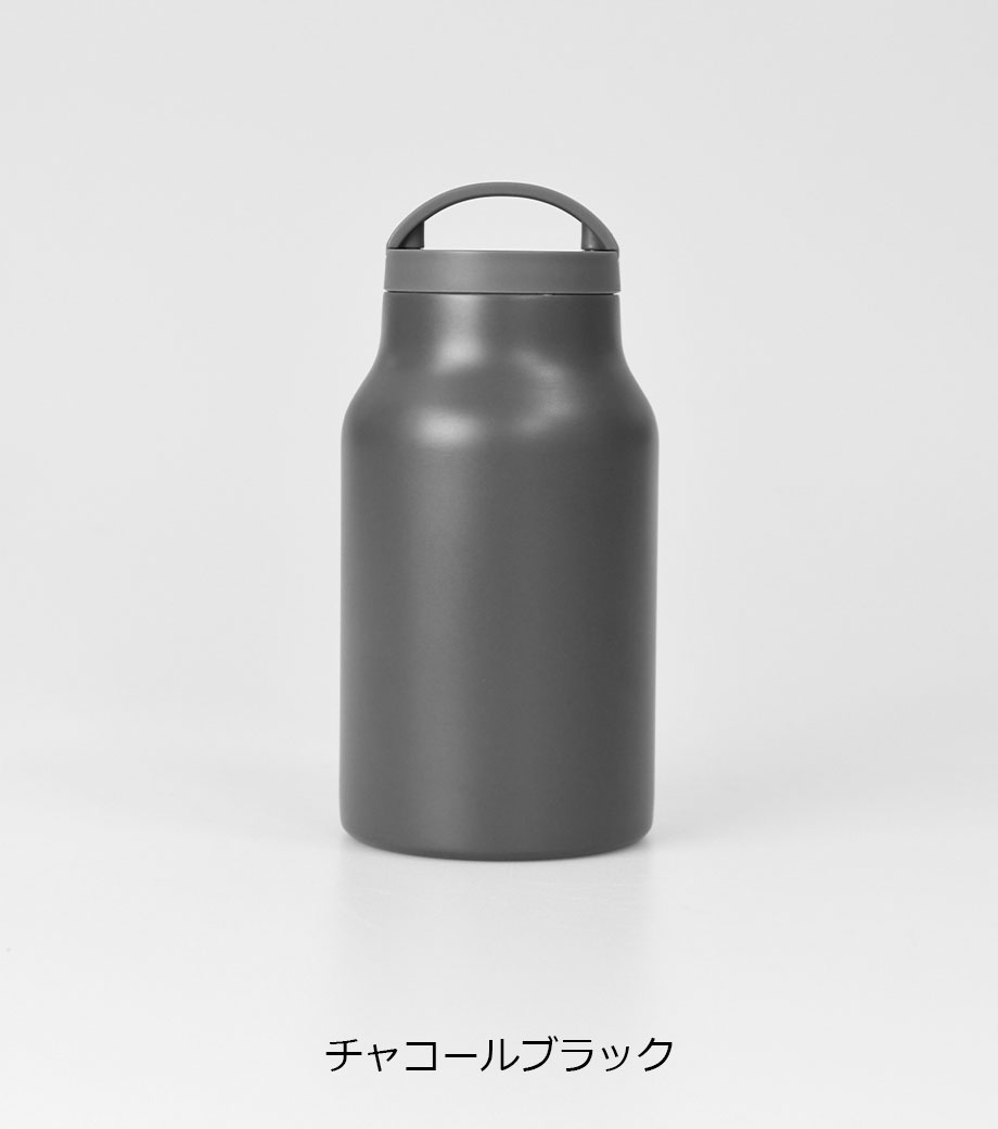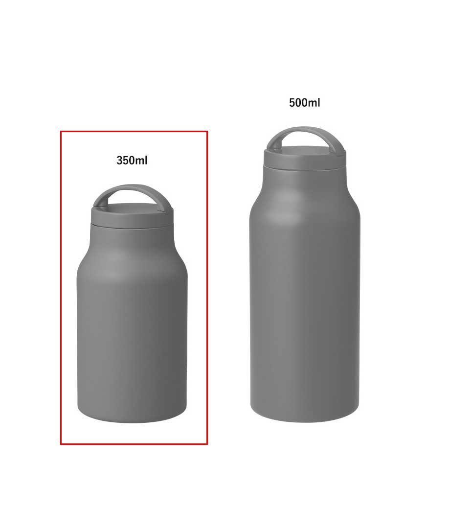 ハンドル付ステンレスボトルは、保冷温効果が高く、飲み頃温度をキープしてくれる真空二重構造。小ぶりのペットボトルと同程度の350mlで、ちょっとしたお出かけにも使いやすい容量です。持ち運ぶのに便利なハンドル付きなので、アウトドアやジムでの水分補給にも使えます。