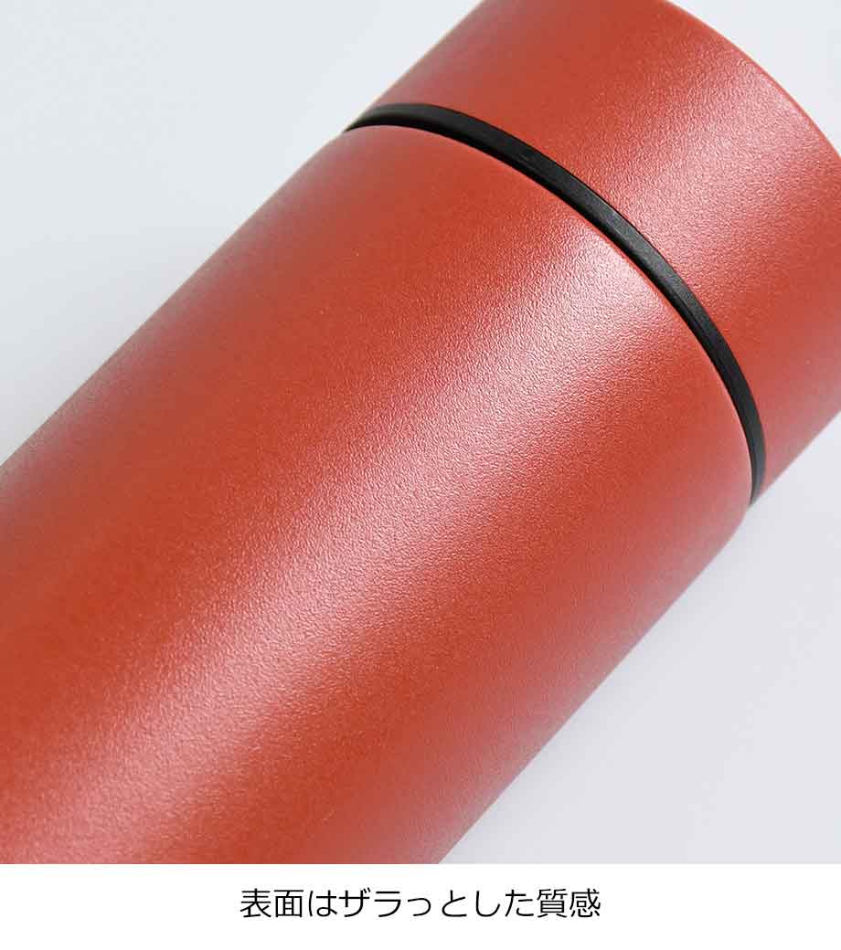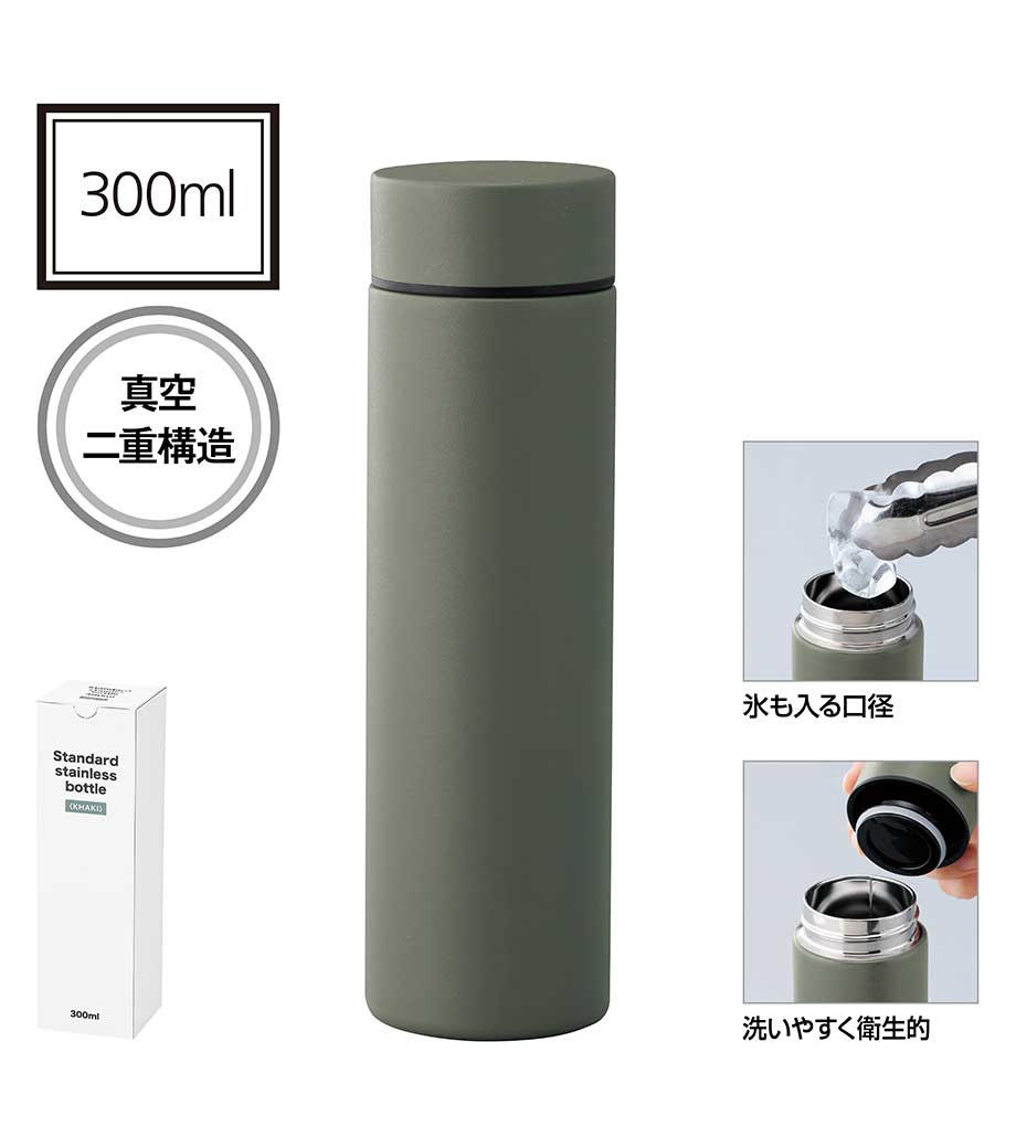 約300ml容量の普段使いに最適なステンレス製ボトル。保温・保冷効果が高い真空二重構造です。表面は手に馴染みやすいザラっとした質感。シンプルながらもおしゃれなデザインです。