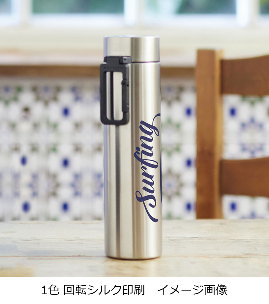 1色印刷で名入れができ、ぐるっと広範囲にも印刷可能です。ボトルは幅広いニーズに応える定番ノベルティ。他にはない便利なカラビナ付きは、貰ってうれしいこと間違いなし!