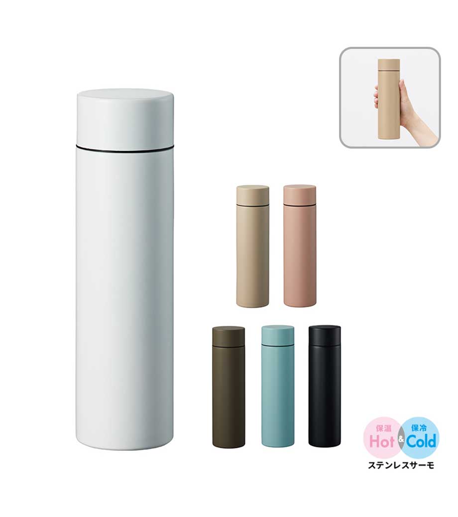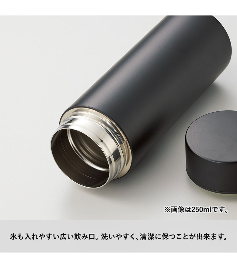 表面は指紋が目立ちにくいマットな質感。名入れが映えるシンプルなデザインのボトルは記念品にぴったりです。1色、2色、フルカラー、レーザー彫刻、ご予算やデザインに合わせて印刷方法をお選びいただけます。