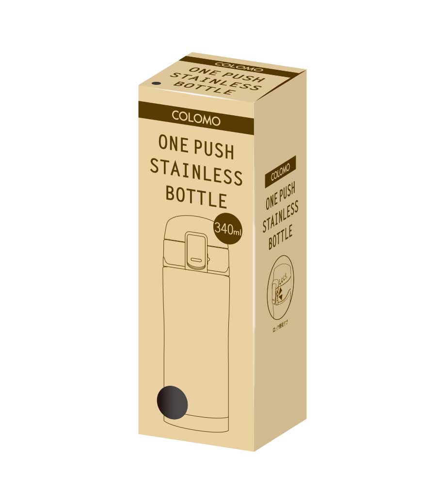 カラモ ワンプッシュ真空ステンレスボトル 340mlは、ワンタッチ式で手軽に水分補給ができます。真空二重構造なので、飲み頃温度をキープ。ロック機能付きで、誤って蓋が開くのを防いでくれます。