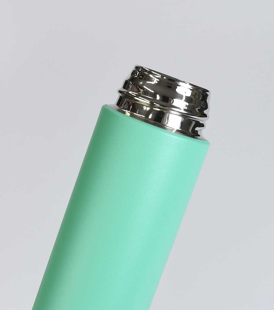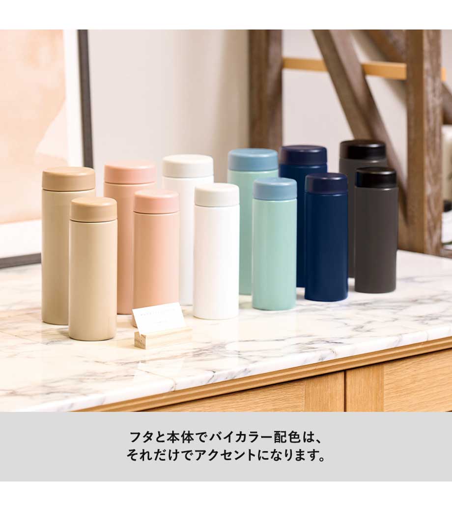 バイカラーサーモステンレスボトル300mlは飲みごろを長時間キープする真空二重構造です。持ち運びやすいサイズ感で、容量はボトル缶と同じくらいの300ml。お出かけや通勤時にもぴったりです。氷も入れやすい広めの口径。キャップのパッキンも取外し可能で、お手入れもしやすいのもポイントです。