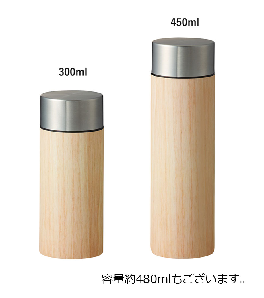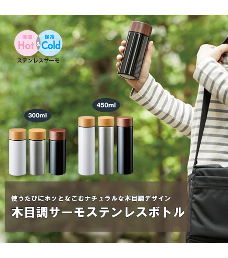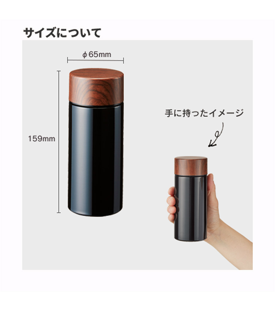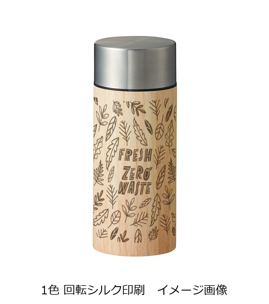 木目調サーモステンレスボトル 300mlは、木目調のキャップがお洒落なサーモボトル。キャップとボトル部分に印刷ができます。