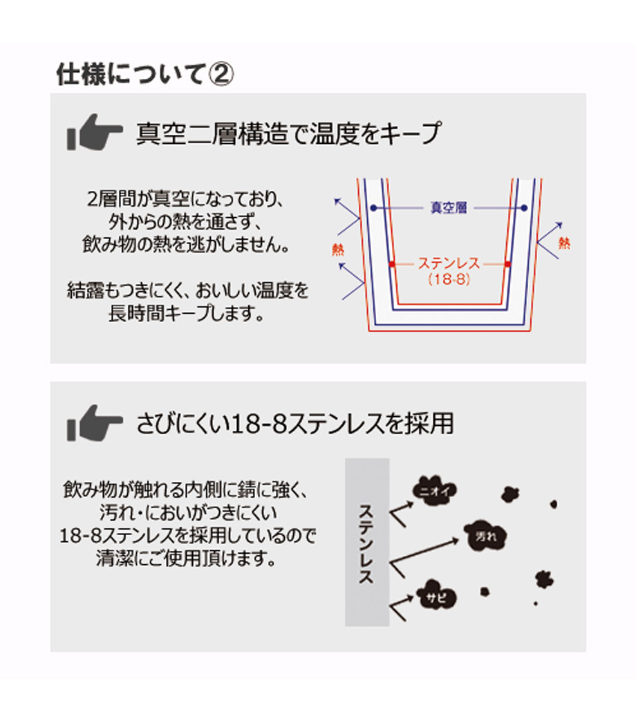 ■内側にSUS304を使用。錆びにくく保温性が高い耐久性抜群のステンレスです。