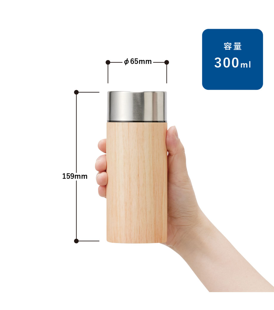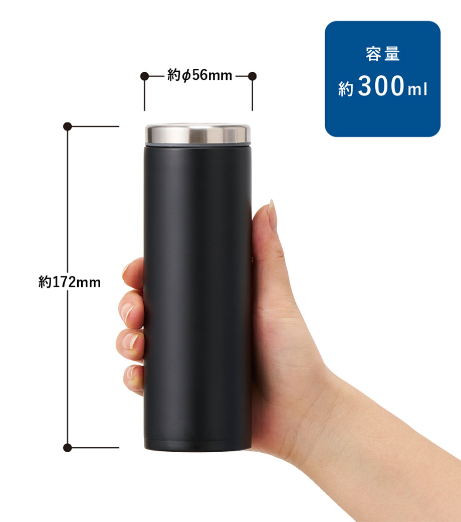 保温保冷に最適なステンレス素材は、錆びにくく丈夫で日常使いにぴったり。容量300mlは、ちょっとお出かけの水分補給に丁度良いサイズです。