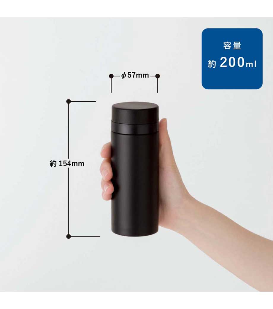 保温保冷に優れた真空二重構造のステンレス製マグボトル。ちょっとしたお出掛けにぴったりな容量200mlの小さめサイズです。氷や熱い飲み物が勢いよく出るのを防ぐ氷ストッパー付き。樹脂素材の飲み口は、唇に触れた時に金属のヒヤリとした感じがなく飲み物をじっくり味わうことができます。