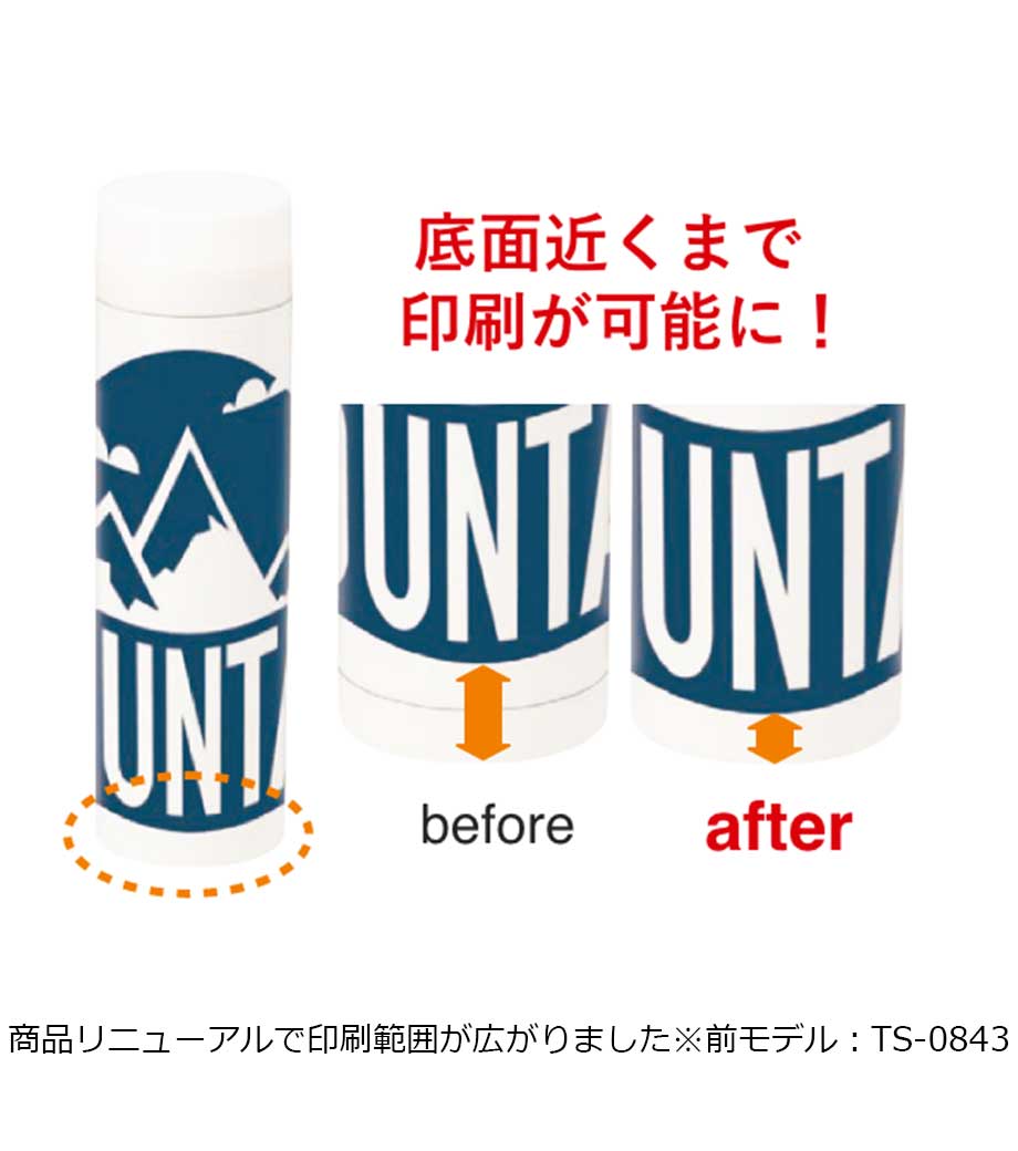 表面は指紋が目立ちにくいマットな質感。名入れが映えるシンプルなデザインのボトルは記念品にぴったりです。1色、2色、フルカラー、レーザー彫刻、ご予算やデザインに合わせて印刷方法をお選びいただけます。