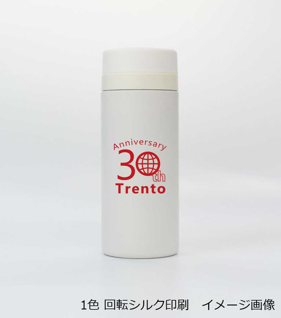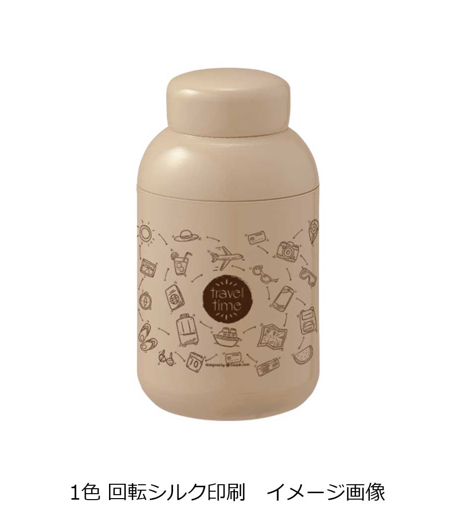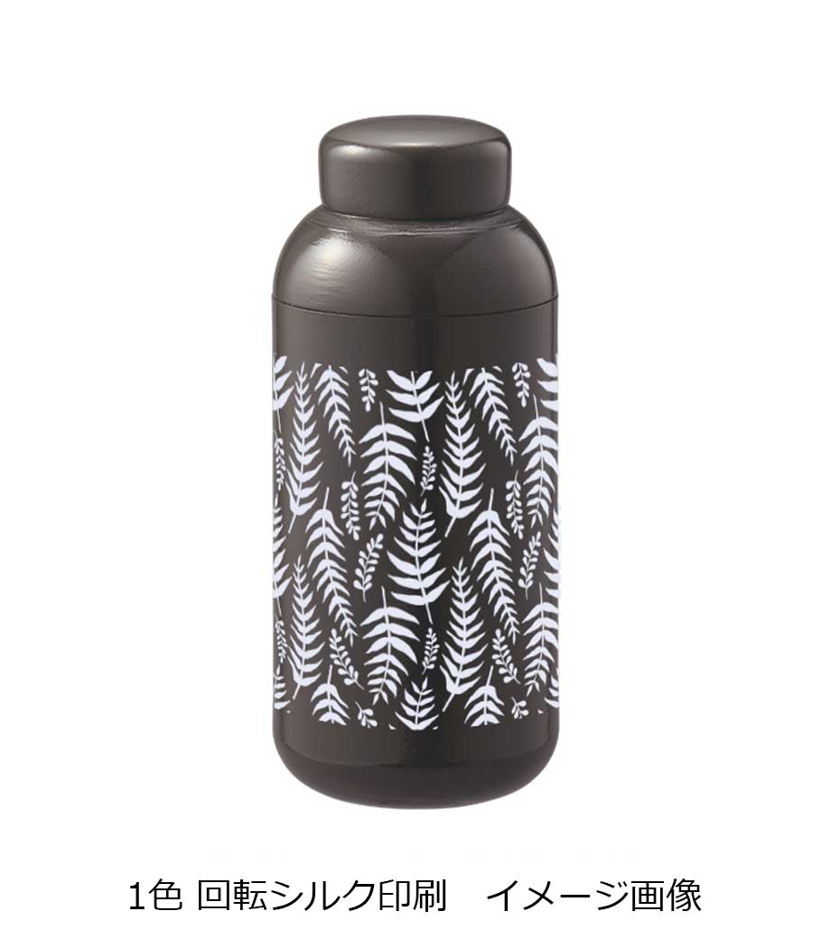 ボトル本体に1色印刷、天面にインクジェット印刷が可能です。回転シルクはくるっと大きく印刷できるので販促効果があります。本体色は優しいパステルカラーのブラウン・グリーン・ブルーの3色取混ぜです。落ち着いたカラーリングで名入れも映えます。女性向けアパレルショップのオープン記念品やコスメの購入特典、ノベルティにおすすめです。