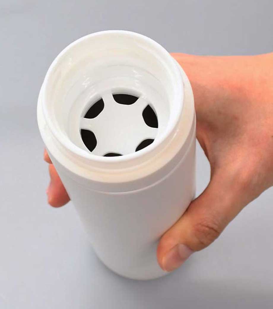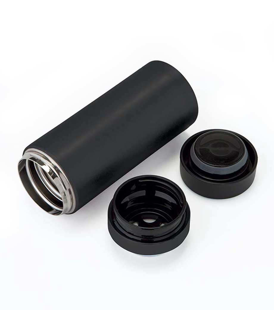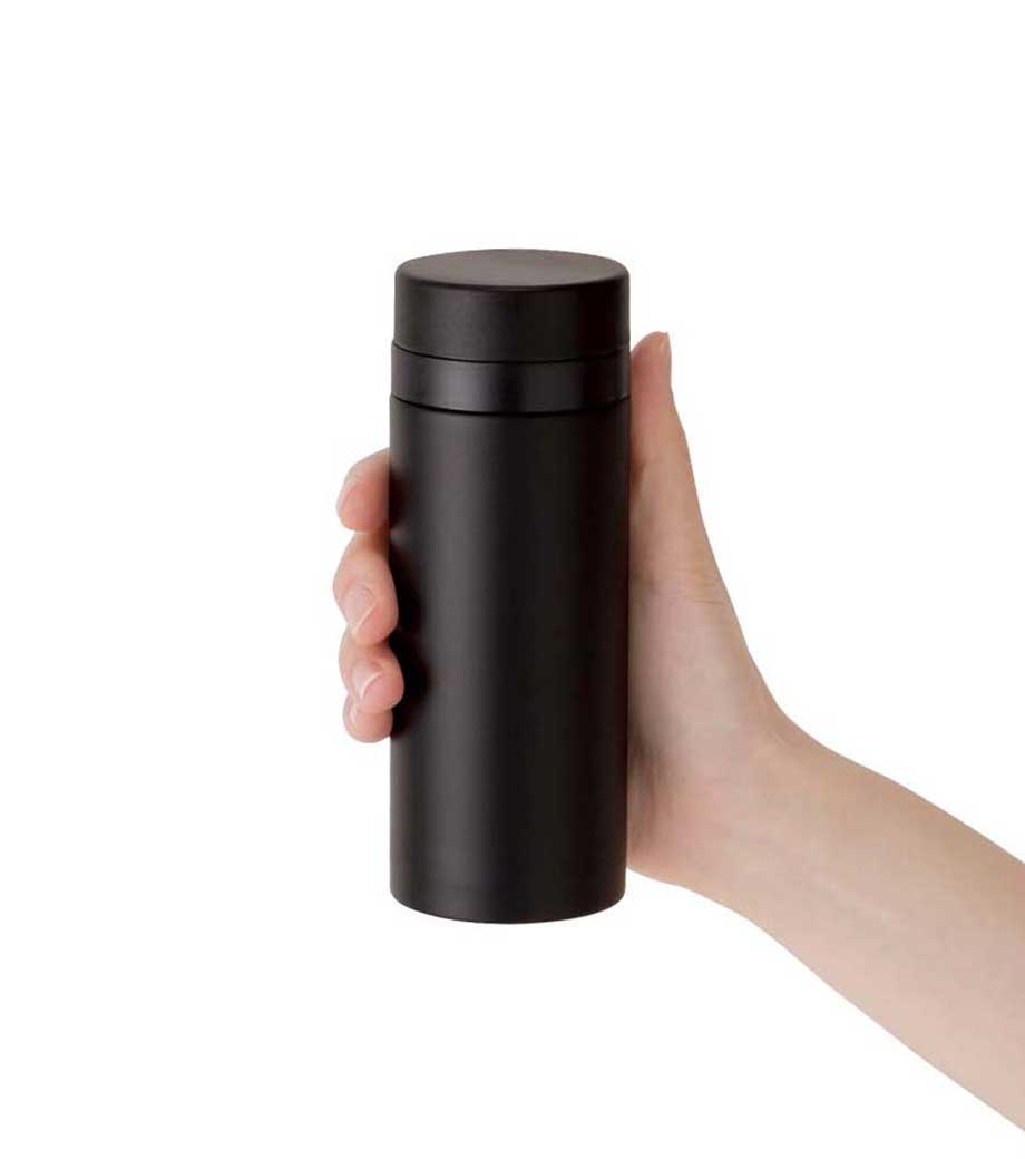 小型の缶やペットボトル飲料がそのまま入る340mlの容量。真空ステンレスだから飲み物の保冷温もバッチリで、JIS規格に基づく試験済みです。飲み口を外すと、氷も入る口径で機能的にも優れています。氷やティーバッグを抑えるストッパー付き。フタ、飲み口、本体は外して洗え衛生的です。