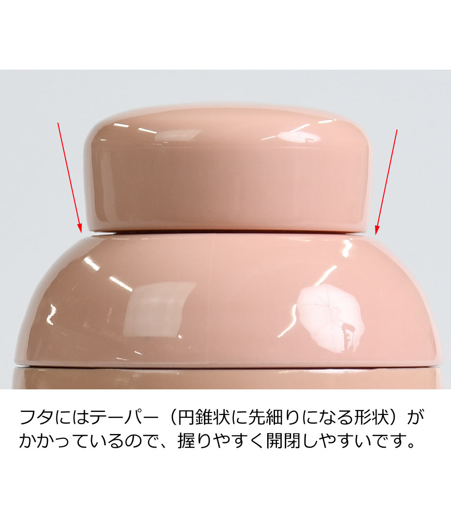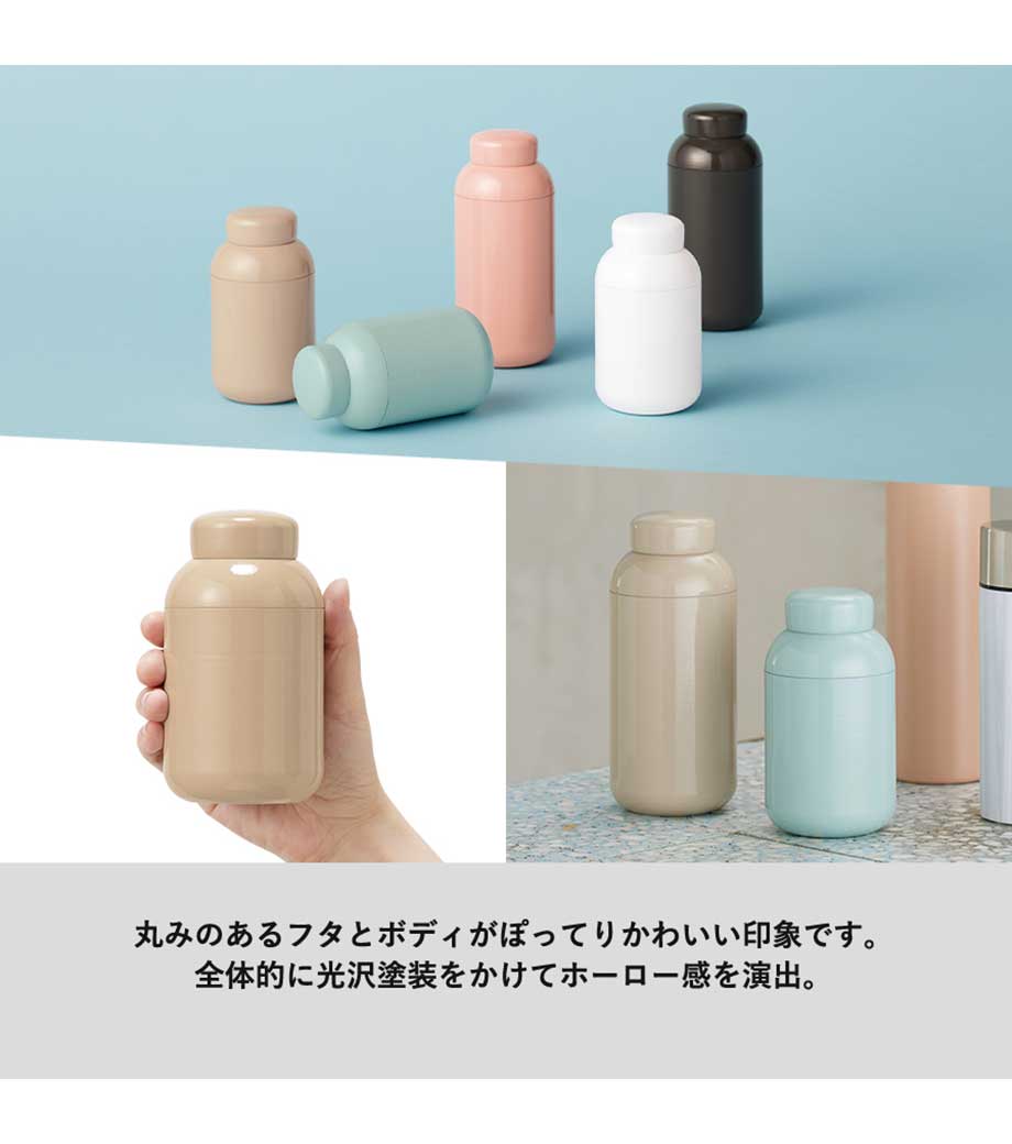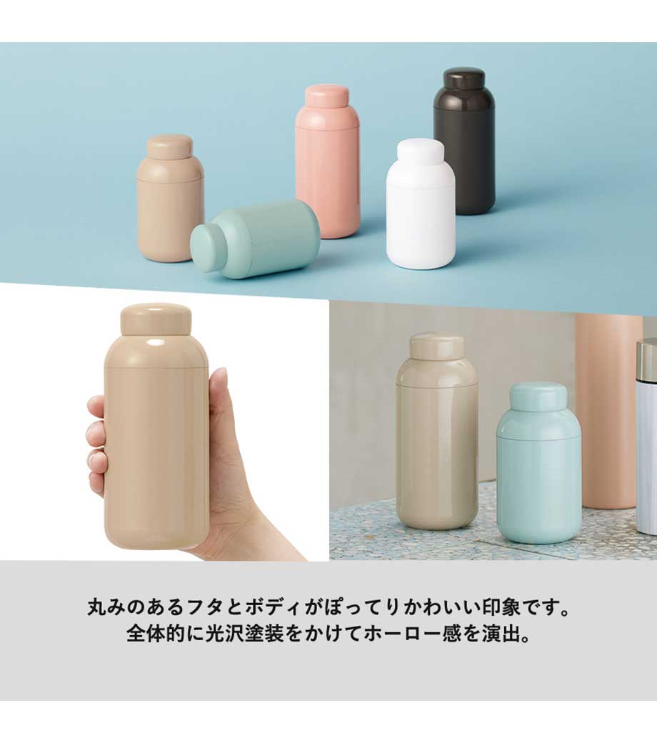 Maluttoサーモステンレスボトル290mlは、丸みのあるフォルムがキュートな真空二重構造のステンレスボトル。テーパーがかかっているフタは他にはないオリジナル形状で、握りやすく開閉しやすいフィット感がたまりません!パーツがフタ・中栓・本体に分解でき、家庭用スポンジでもすみずみまで洗えて清潔に保てます。高さが低いのでランチバッグや小ぶりの通勤バッグにも入るのが嬉しいですね。