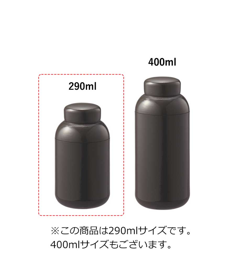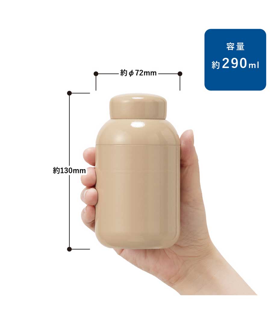 片手でポンっとラクに開けられる便利なステンレスボトルです。真空二重構造で飲み頃温度をキープしてくれます。フタが開かないようロック機能付きで、カバンの中でも安心。底にはすべり止め付きで滑りにくいのもうれしい。容量約300mlは、大きめの缶ジュースと同じくらいのサイズです。