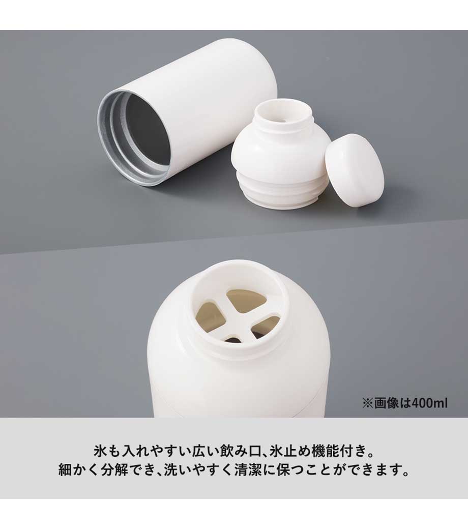 ステンレス2層で保冷温性も高く、錆びにくく耐久性も優秀な18-8ステンレス。飲み口は氷が飛び出さない仕様。外出先での水分補給に便利な携帯ボトルです。サイズ違いで350mlもあります。