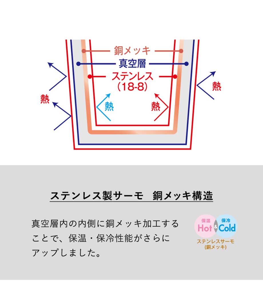 保冷温効果が長持ちする真空断熱二重構造も嬉しいポイント。軽量な上にスリムタイプなのでバッグの中でも幅を取らずお出かけにもとっても便利なアイテムです。